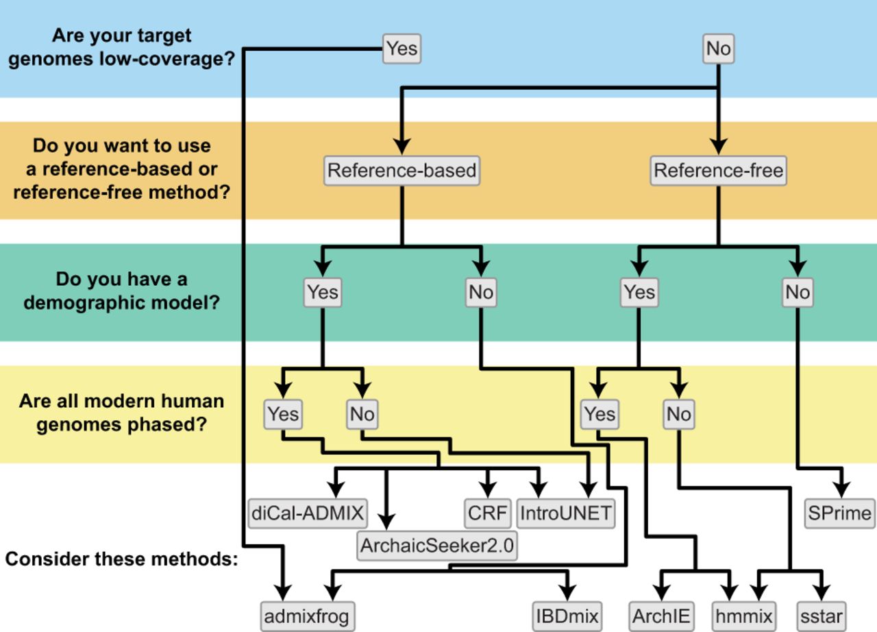 Recommendations for identifying introgressed segments along the genome. Decision tree to determine which inference methods are appropriate for characterizing local patterns of introgression based on data availability.