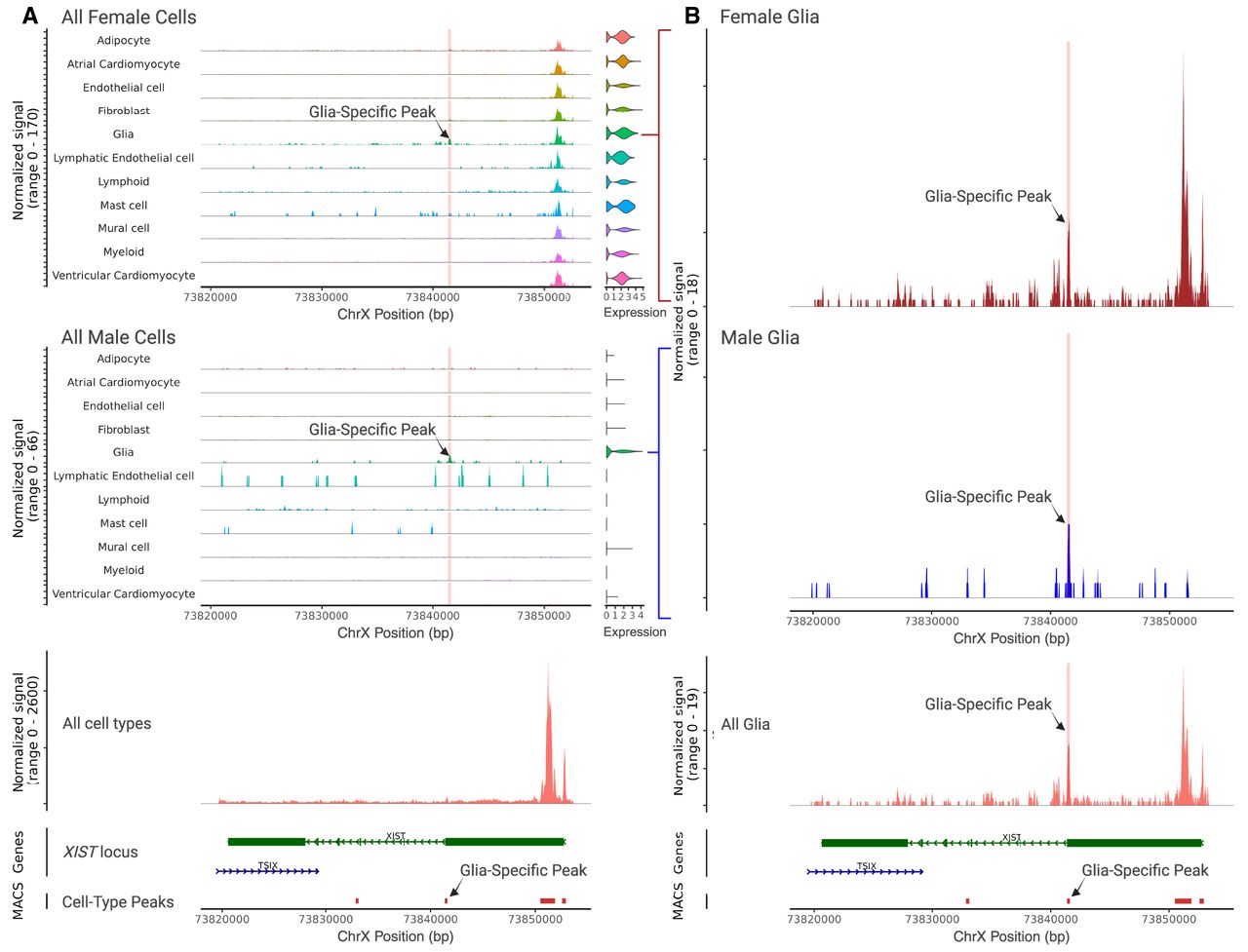 Chromatin accessibility at the XIST locus across human heart cell types. (A) Multiomic scATAC/RNA-seq signal and expression (split by sex) across cell types. MACS2-called peaks are represented as “cell-type peaks.” The normalized signal across all cells and fragments for 100 random cells are presented above the XIST gene locus, with introns and exons as thin and thick green lines, respectively. (B) A zoomed-in view of scATAC-seq signal for male (blue) and female (brown) glia. (A,B) The red highlighted region represents the glia-specific peak (Chr X: 73,841,364–73,841,611) called by MACS2.