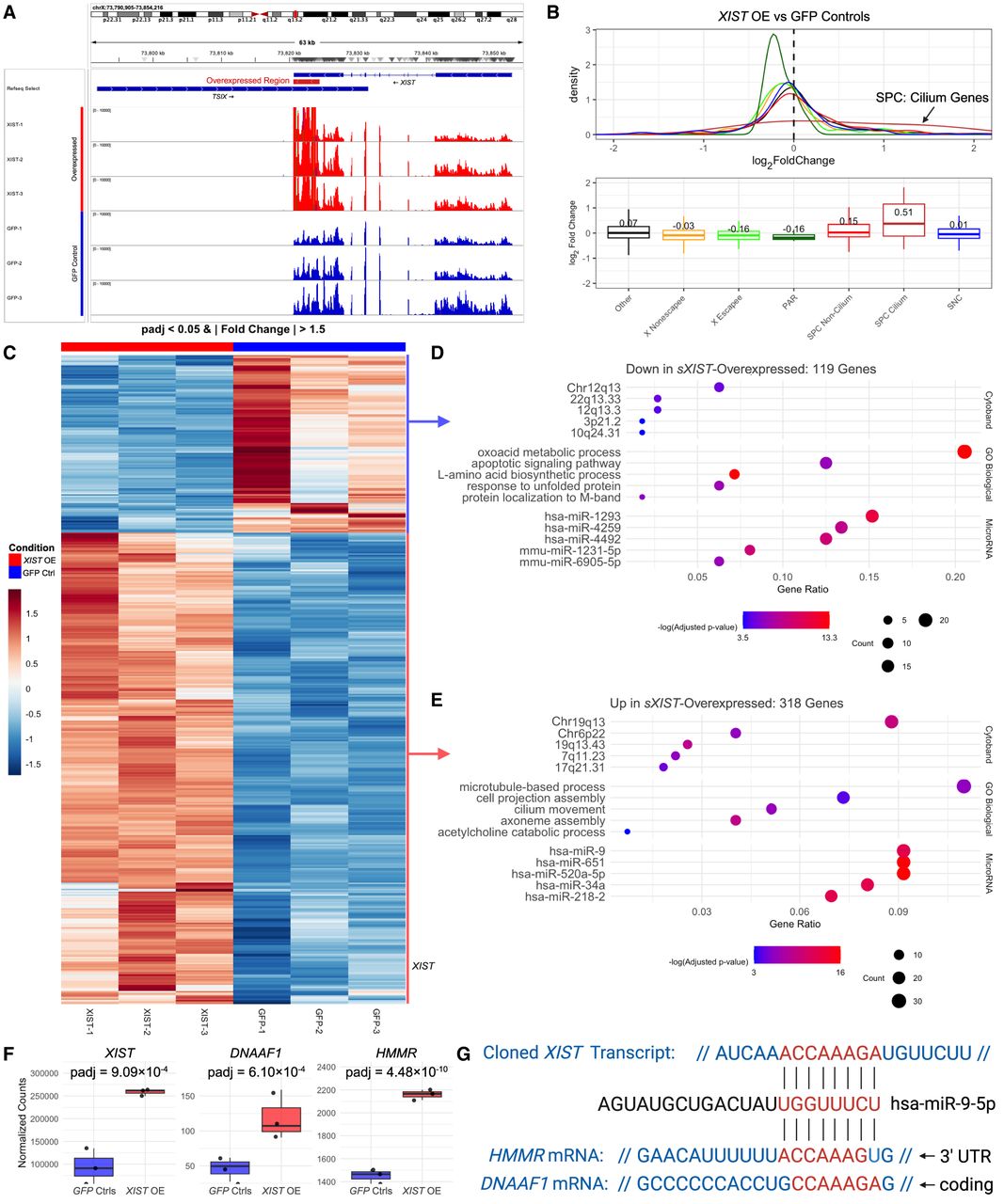 RNA-seq analysis of sXIST overexpression. (A) IGV tracks showing RNA-seq reads over Chr X: 73,790,905–73,854,216, with TSIX and XIST indicated. Samples overexpressing the second half of exon 6 (XIST OE) are shown in red, and GFP controls (Ctrl) are in blue. (B) Density and boxplots showing log2FC values across gene groups. Values above boxplots are the mean log2FC for that group. (C) Heatmap of the DEGs (adjusted P-values < 0.05 and |fold change| > 1.5). (D,E) ToppFun results from downregulated (D) and upregulated (E) genes in C. (F) Boxplots showing the expression of XIST, DNAAF1, and HMMR. (G) Cloned XIST, DNAAF1, and HMMR transcript sequence alignments with hsa-miR-9-5p.
