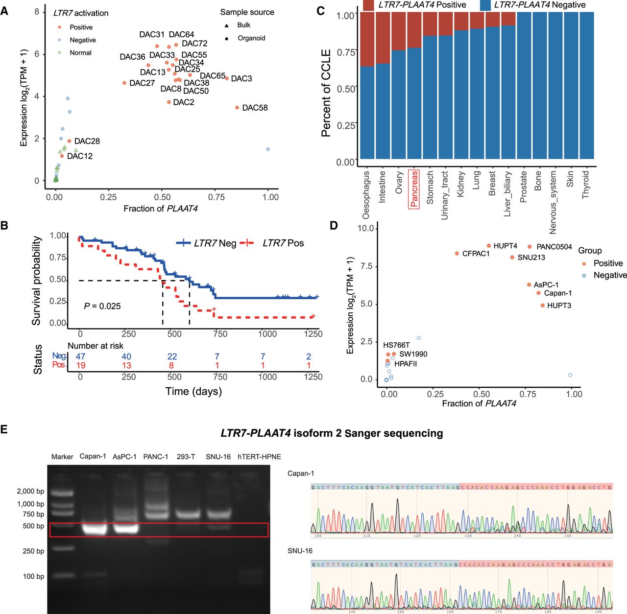 Expression profiling of LTR7-PLAAT4 across PAAD organoids and various cancer cell lines. (A) Scatterplot illustrating the expression and fraction distribution of LTR7-PLAAT4 across organoids and bulk samples (n = 110). Orange represents tumor samples positive for LTR7-PLAAT4; blue represents tumor samples negative for LTR7-PLAAT4 (lacking supporting splicing reads or with expression level <1 TPM); green represents normal samples; triangles and circles denote bulk samples and organoid samples, respectively. (B) Comparison of overall survival (OS) between the groups with and without LTR7-PLAAT4 existence in the organoid cohort (n = 66), assessed using the log-rank test. (C) Frequency distribution bar plot of the LTR7-PLAAT4 identified in CCLE cancer cell lines data sets, arranged from left to right based on the frequency of detection in cell lines (n = 685). (D) Expression and fraction distribution of LTR7-PLAAT4 across pancreatic cancer cell lines (n = 41). (E) PCR results following nested PCR were obtained for Capan-1, AsPC-1, and SNU-16 cell lines (which tested positive for LTR7-PLAAT4 isoform 2), as well as for PANC-1, 293-T, and hTERT-HPNE cell lines (which tested negative for LTR7-PLAAT4 isoform 2). Representive Sanger sequencing results of Capan-1 and SNU-16 were displayed.