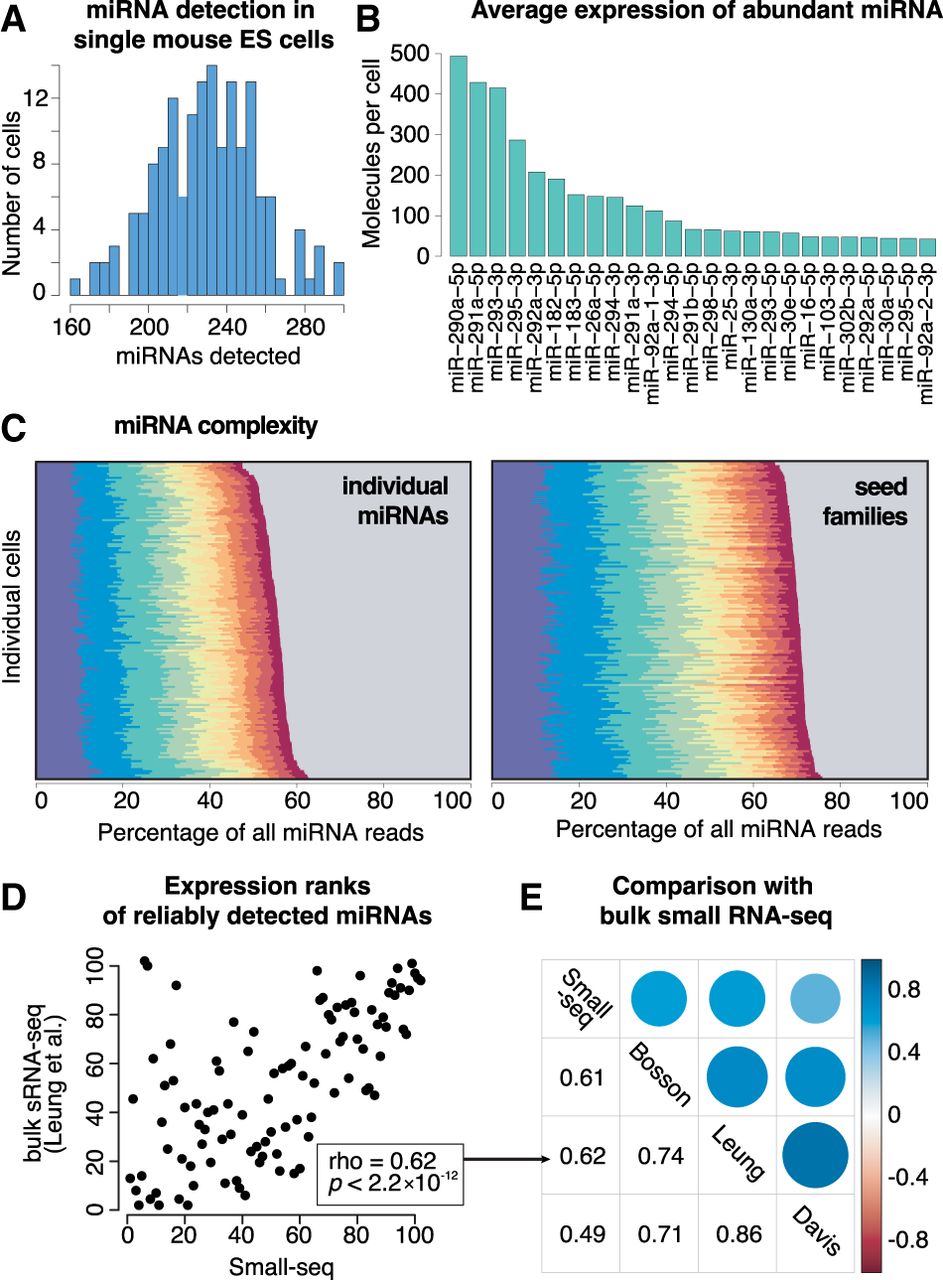 miRNA profiling in single mouse embryonic stem cells (mESCs) by Small-seq. (A) Number of distinct miRNAs detected in each single cell. (B) Top 25 miRNAs in mESCs. The number of detected molecules was estimated using unique molecular identifiers (UMIs) to resolve PCR duplicates. (C) Expression of top 10 miRNAs in 192 individual single cells. The gray area represents the contribution of all miRNAs other than the top 10 ones. (Left) Individual miRNAs: miR-290a-5p, miR-291a-5p, miR-293-3p, miR-295-3p, miR-292a-3p, miR-182-5p, miR-183-5p, miR-26a-5p, miR-294-3p, and miR-291a-3p. (Right) Families: miR-291a-3p/294-3p/295-3p/302abd-3p, miR-290a-5p/292a-5p, miR-291-5p, miR-293-3p, miR-25-3p/32-5p/92-3p/363-3p/367-3p, miR-292a-3p/467a-5p, miR-182-5p, miR-30-5p/384-5p, miR-26-5p, and miR-183-5p. (D) Expression rank of miRNAs detecting in mESCs by Small-seq and bulk small RNA-seq (Leung et al. 2011). Lower rank means higher expression. (E) Spearman's rank correlation coefficient between miRNA expression as profiled by Small-seq and three representative bulk small RNA-seq data sets (Leung et al. 2011; Davis et al. 2012; Bosson et al. 2014).