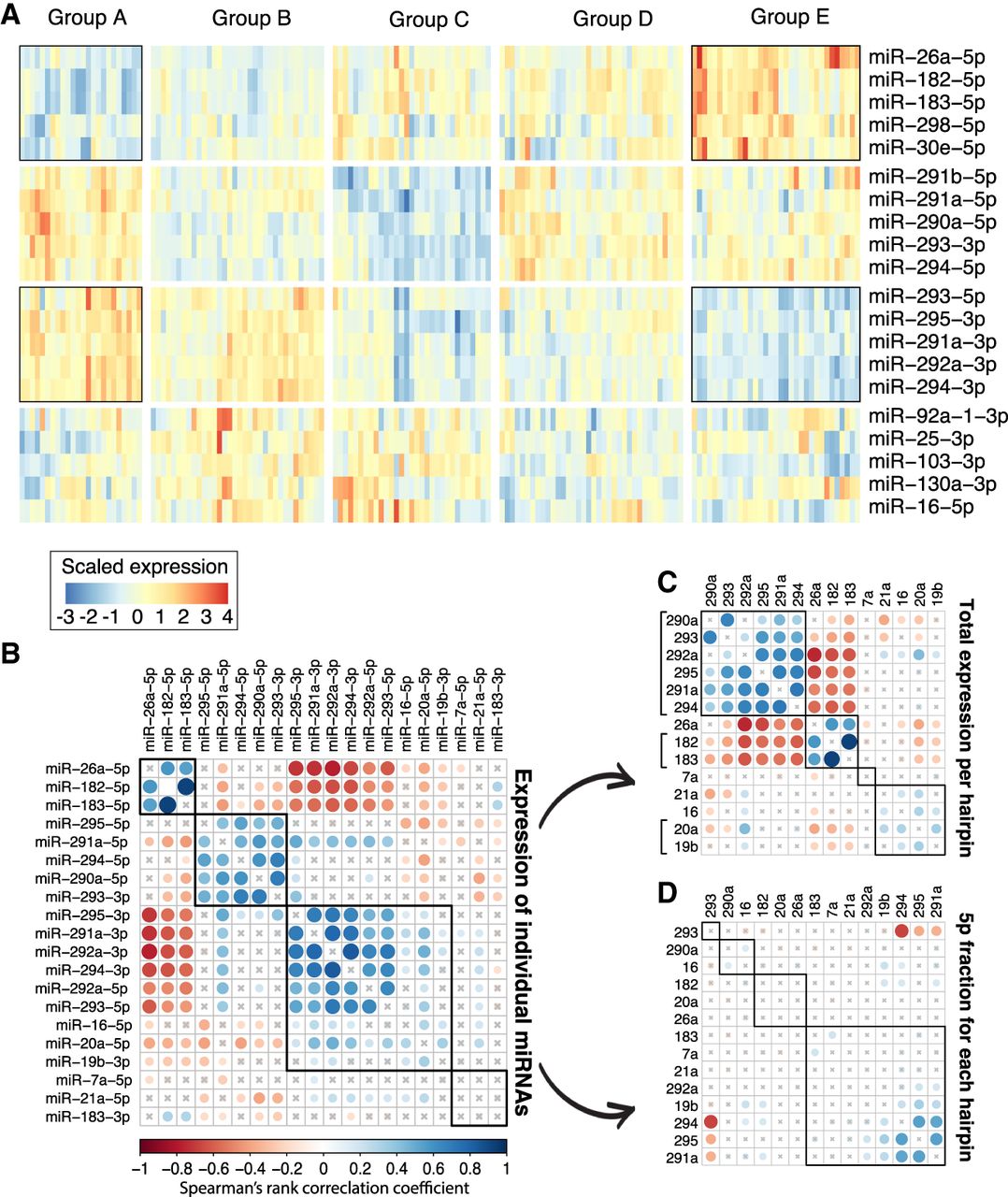 miRNA expression covariation across single mESCs. (A) Four distinct miRNA coexpression groups across 192 cells. The miRNAs (rows) and cells (columns) were grouped using unsupervised hierarchical clustering. Red color indicates high expression relative to the mean for the given miRNAs; blue color indicates low expression. (B) Correlation between expression of miRNA strands. Blue color indicates positive correlation, and red indicates negative correlation. (C) As in B, but summing expression from 5′ and 3′ arms of each miRNA hairpin. (D) As in B, but the correlation was done on the fraction of sequenced RNAs that originate from the 5′ arm of the hairpin. Blue color indicates that the two miRNA hairpins have similar arm select across the cells, and red color indicates that the two hairpins have opposite arm selection across cells.