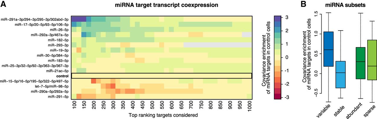 Expression covariation of miRNA targets in single mESCs. (A) Heatmap of miRNA target covariation across single cells. The covariation enrichment was performed as previously described (Tarbier et al. 2020). Blue color indicates mRNAs that are coexpressed more frequently than expected by chance; red color indicates mRNAs that are coexpressed less frequently than expected by chance. (B) Covariance enrichment for targets of miRNAs belonging to different groups, considering the top expressed 16 miRNA families. “Variable” indicates the eight miRNA families with the highest expression variation, and “stable” indicates the eight miRNA families with the most stable expression. “Abundant” indicates the eight top expressed miRNA families, and “sparse” indicates the eight least expressed miRNA families among this set.