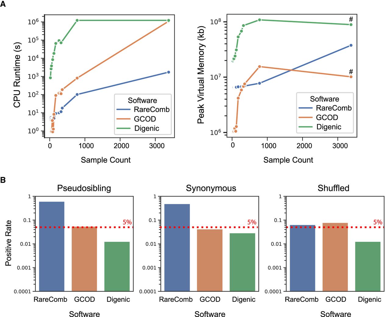 GCOD efficiently evaluates oligogenic gene sets while limiting type-I errors. (A) CPU runtime (left) and peak RAM usage (right) of GCOD and two other cohort-based oligogenic discovery software tools. Analyses were completed for the full PCGC cohort as well as smaller subdiagnoses of CHD, providing a range of sample sizes (x-axes). Across a range of sample sizes, GCOD's runtime is slower than RareComb's but faster than Digenic's, becoming equivalent to Digenic for the full cohort of 3377 trios (left). Peak memory usage is lower for GCOD compared with the other methods at most sample sizes (right). We note that peak memory, unlike CPU time, does not sum across multiple parallel threads; this explains the drop for peak memory in GCOD and digenic at higher cohort sizes, which were parallelized (indicated by # for parallelized runs). (B) Type-I error rate of the three methods, using pseudosibling variants with CADD scores in the top 0.5% exome-wide (left), proband synonymous variants (center), and variants with shuffled family IDs (right) as controls. GCOD controls the false-positive rate at ∼5% (dashed line), whereas Digenic is relatively conservative and RareComb is anticonservative.
