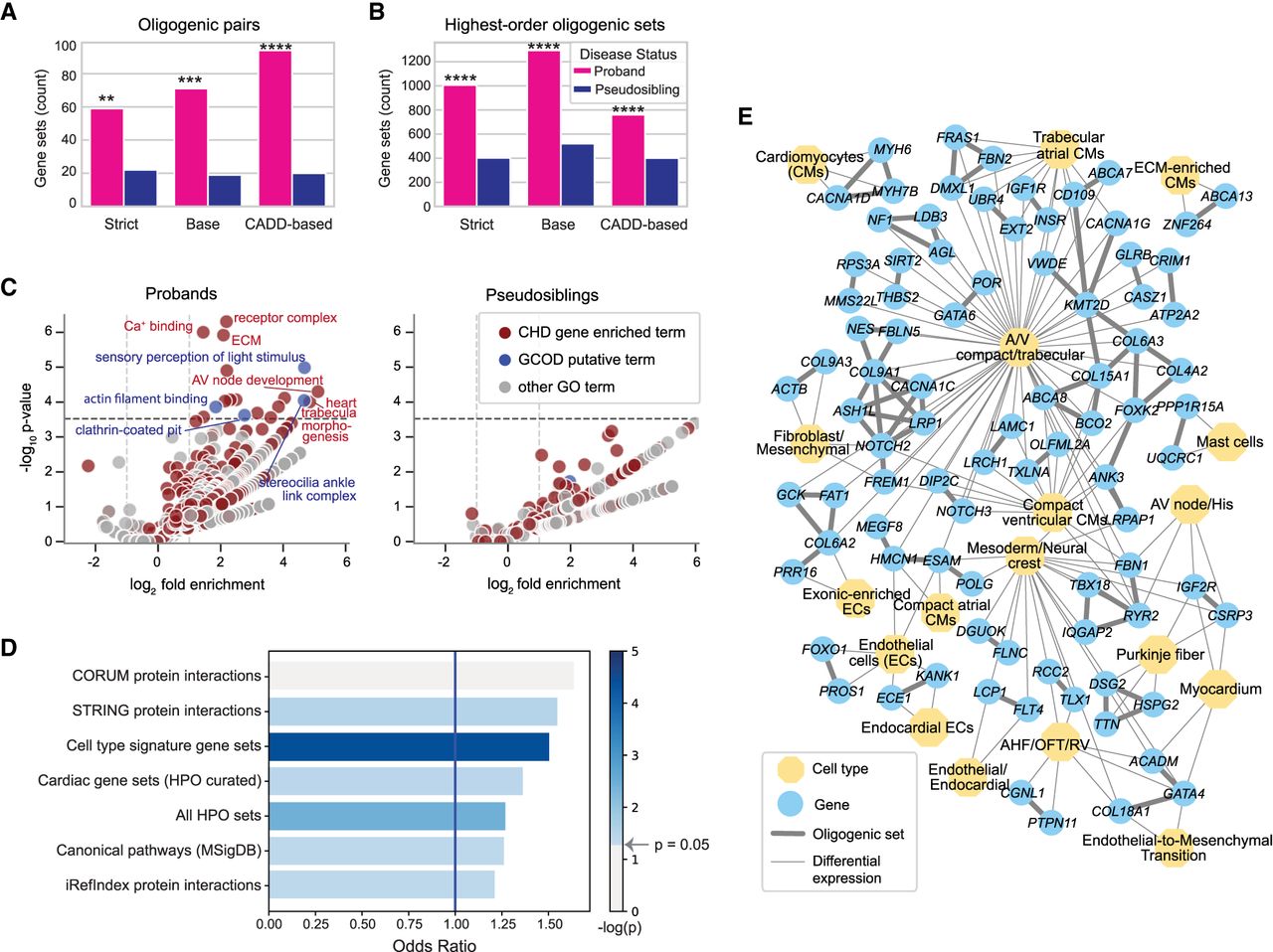 Greater number and phenotypic relevance of co-occurring gene sets in CHD probands. (A) Counts of gene pairs that were transmitted to offspring more often than expected by chance. Oligogenic pairs were found among probands at a greater rate than their pseudosibling controls for all three variant severity cutoffs, with asterisks indicating significance level: FDR-corrected P-value, (****) P ≤ 1 × 10−10, (***) P ≤ 1 × 10−5, (**) P ≤ 1 × 10−3). (B) Counts of highest-order oligogenic sets transmitted more often than expected by chance to probands and pseudosiblings. Highest-order gene sets were found among probands at a greater rate than their pseudosibling controls, with asterisks indicating significance as in A. (C) GO term enrichment of genes in CHD oligogenic pairs found in probands (left) and pseudosibling controls (right). GO terms are plotted based on fold enrichment and the inverse log of Fisher's exact test P-value. Point color indicates whether a GO term was enriched for known CHD genes or was enriched at or above marginal significance for genes in proband oligogenic pairs (indicated by the dotted line at FDR < 0.1), but not enriched for known CHD genes. Pseudosibling set genes were not enriched for any GO terms at or above marginal significance (FDR = 0.1). (D) Odds that at least two genes in an oligogenic set (pairs and highest-order) occurred in CHD probands and co-occur in a canonical gene set, pathway, or protein–protein interaction. Color indicates the inverse log P-value of the odds ratio (Fisher's exact test). (HPO) Human Phenotype Ontology. (E) Network visualization of oligogenic sets containing two or more differentially expressed genes (circular nodes) identified together in at least one cardiac cell type (octagonal nodes), sourced from six studies. Thin edges indicate differential expression of a gene within the cell type compared with other study cell populations; bold edges between gene nodes indicate genes that were discovered together in a GCOD oligogenic set. (CMs) Cardiomyocytes, (ECs) endothelial cells; (A/V) atrial/ventricular, (AHF) anterior heart field, (OFT) outflow tract, (RV) right ventricle.