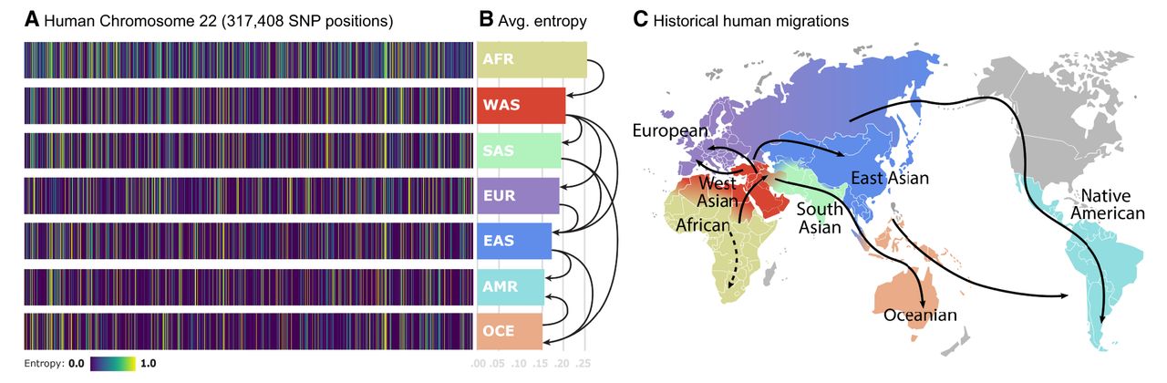 SNP entropy variation between populations. (A) We find 317,408 SNP entropies computed for human Chromosome 22 for each continental population. Observe that the uncertainty levels for particular SNP positions are different for each population. This is directly related to genetic variability. (B) Average of entropy vectors from A. Those values would correspond to estimated lower bounds of compression for each human population. Arrows represent the migration paths. (C) World map showing the main directions of human population migrations.
