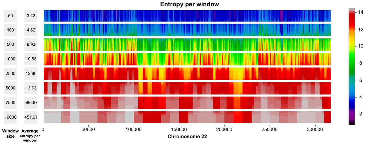 Average entropy per window across different window sizes on Chromosome 22. For each window size w ∈ {50, 100, 500, 1000, 2500, 5000, 7500, 10,000}, we compute the average entropy per window over the entire chromosome.