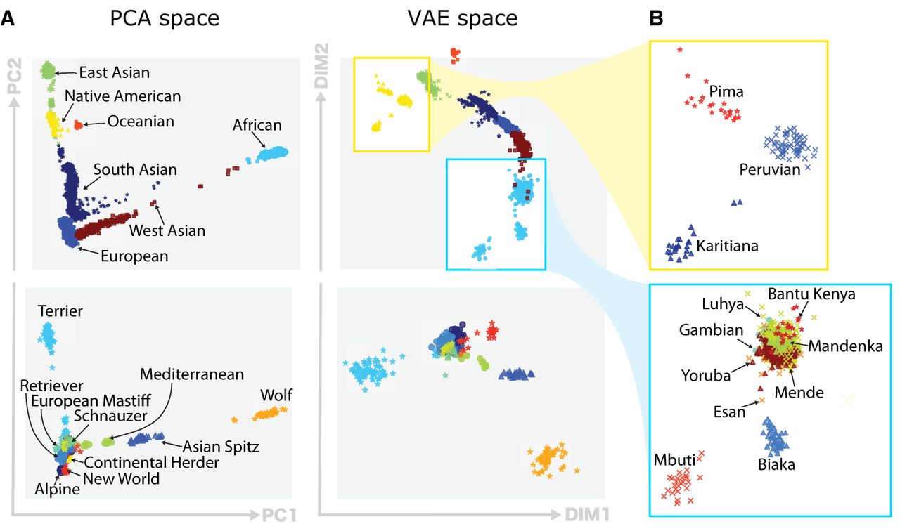 Qualitative comparison of PCA and VAE projections. (A) The top row illustrates the projections generated by both PCA and VAE for 4894 human samples using 839,629 SNPs. The second row displays projections of 489 canine samples using 198,473 SNP positions. (B) Focus of VAE projections of Native American-like subpopulations (in yellow) and African subpopulations (in blue).