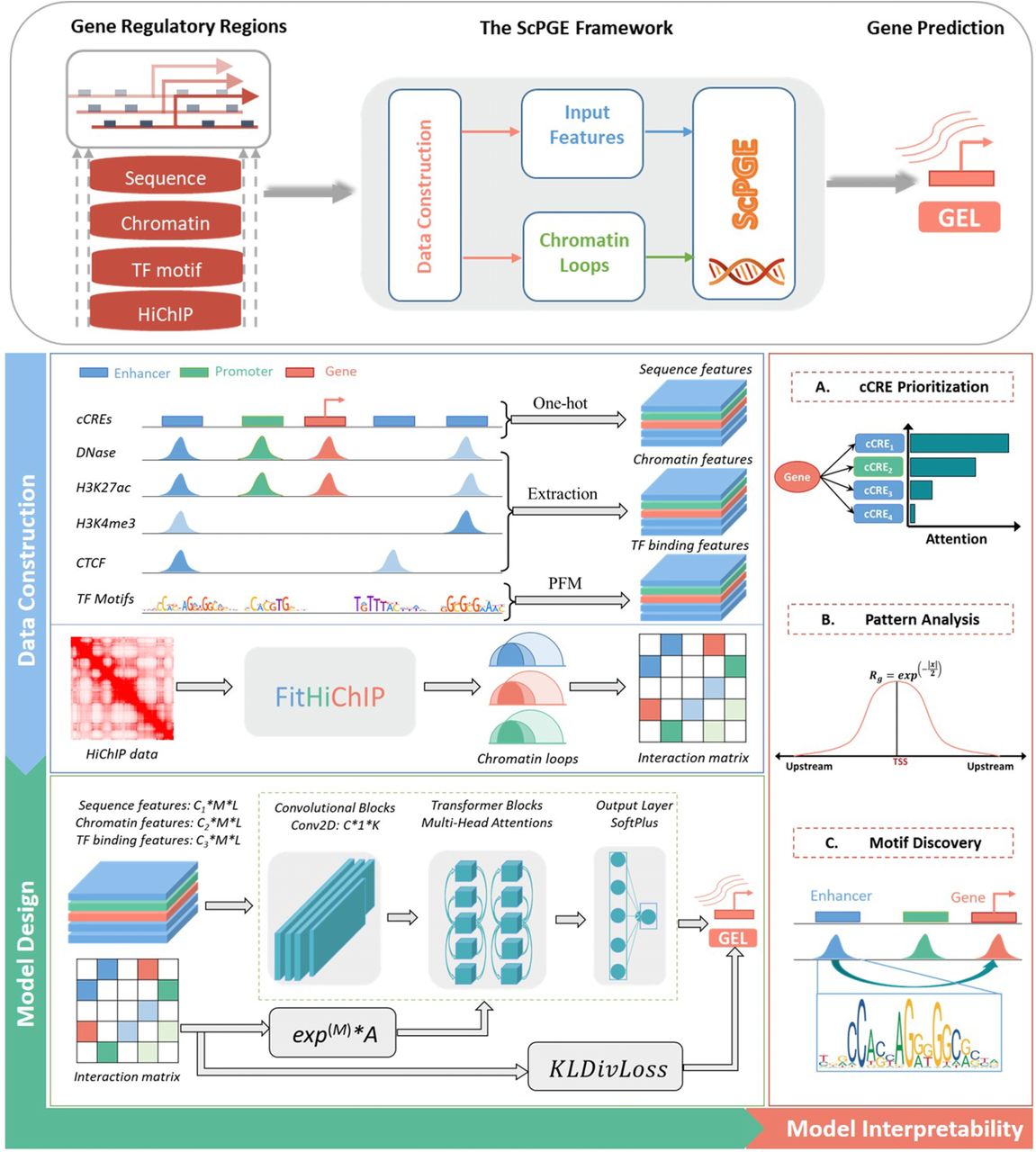The framework of ScPGE. The framework predicts gene expression by integrating sequence features, chromatin features, TF motif features, and HiChIP interactions of discrete candidate cCREs on both sides of genes. During the stage of data construction, we transformed sequence features, chromatin features, and TF motif features into three-dimensional tensors and converted chromatin loops identified by FitHiChIP into interaction matrices. During the stage of model design, we combined CNN and transformer to predict gene expression, where CNN is used to learn sequence and chromatin features and transformer is used to learn the relationships between genes and cCREs. Meanwhile, we designed two ways to improve the performance of ScPGE by incorporating chromatin loops. In the stage of model interpretability, we performed cCRE prioritization, pattern analysis, and motif discovery.