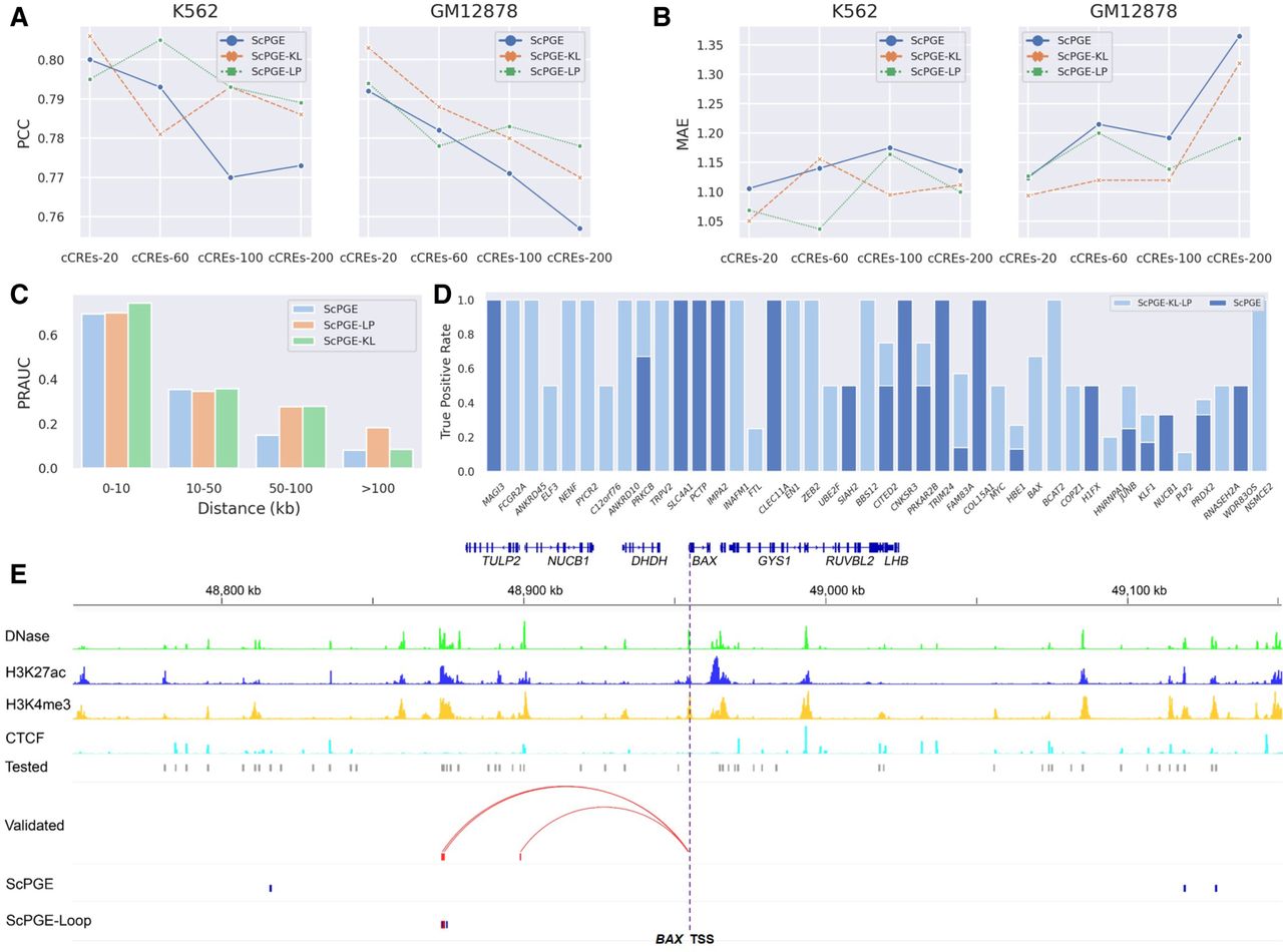Chromatin loops facilitate ScPGE to capture cCRE–gene interactions. (A,B) Comparison of the performance of ScPGE, ScPGE-KL, and ScPGE-LP as the number of cCREs increases. (C) The performance (PRAUC) of ScPGE, ScPGE-KL, and ScPGE-LP in classifying cCRE–gene pairs at different distance groups. (D) The true positive rates of ScPGE and ScPGE-Loop on validated ccREs. (E) Visualization of active cCREs of the BAX gene missed by ScPGE but identified by ScPGE-Loop, where validated cCREs are represented by red rectangles and correctly identified cCREs are represented by blue rectangles with red outlines.