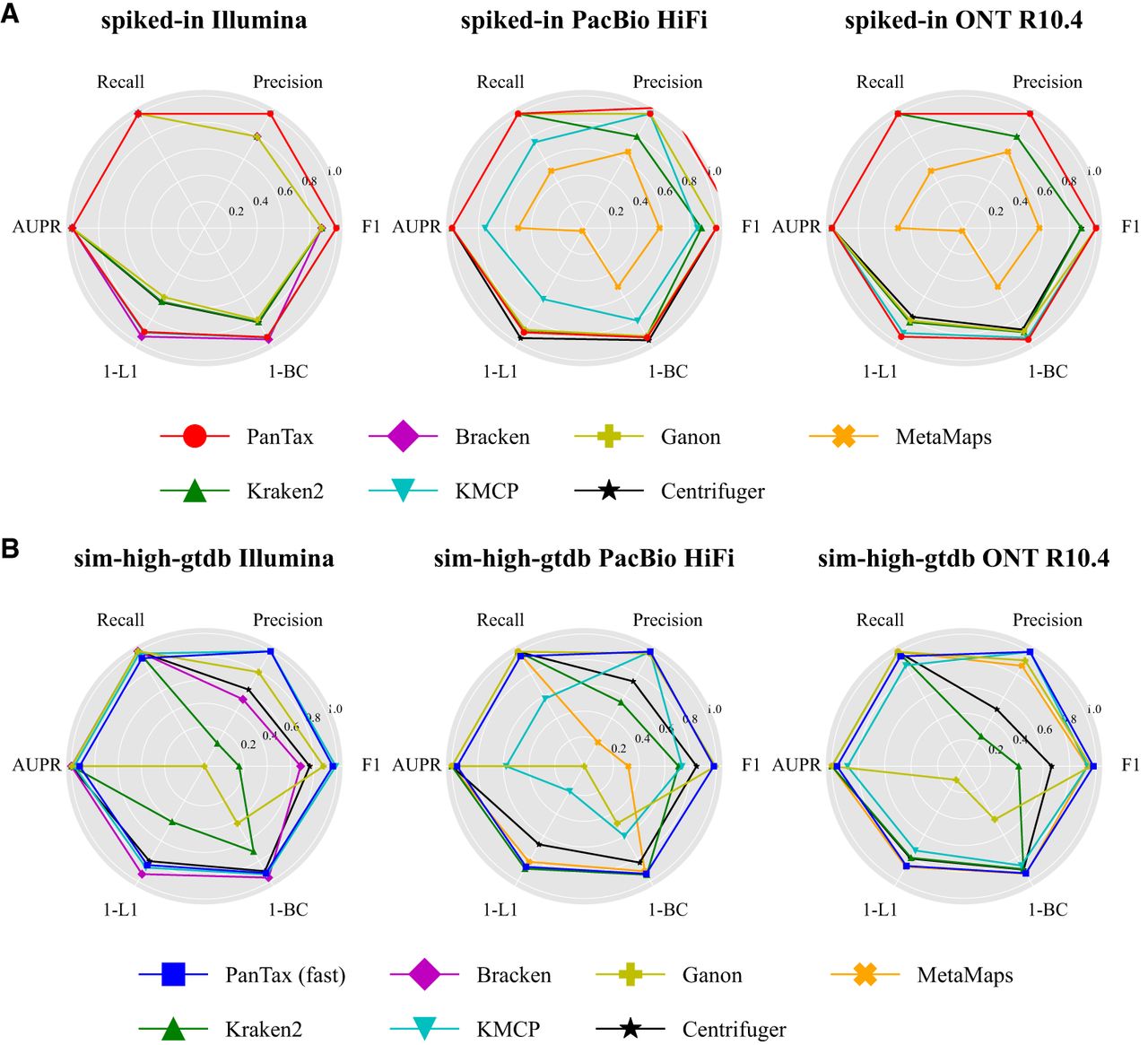Benchmarking results of strain-level taxonomic profiling. (A) Profiling for spiked-in data sets. (B) Profiling for simulated data sets (sim-high-gtdb) using the GTDB reference database. To visualize all metrics consistently (i.e., with higher values indicating better performance), we present the 1-L1 distance and 1-BC distance. (AUPR) Area under the precision-recall curve.