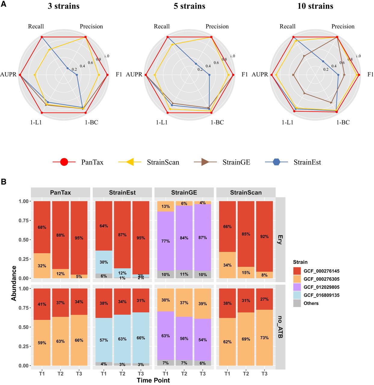 Benchmarking results of single species strain-level taxonomic profiling. (A) Simulated data sets (S. epidermidis strain mixtures: three strains, five strains, and 10 strains). (AUPR) Area under the precision-recall curve. To visualize all metrics consistently (i.e., with higher values indicating better performance), we present the 1-L1 distance and 1-BC distance. (B) Real data sets: two-cultured S. epidermidis strain mixtures. The x -axis represents time points, and the y -axis shows the relative taxon abundance of each identified strain. The two strains (marked in red and yellow) were mixed in equal proportions (1:1) and cultured under two conditions: one with erythromycin treatment (Ery) and one without antibiotics (no_ATB). The upper and lower panels display the strain abundances predicted by four tools under Ery and no_ATB, respectively.