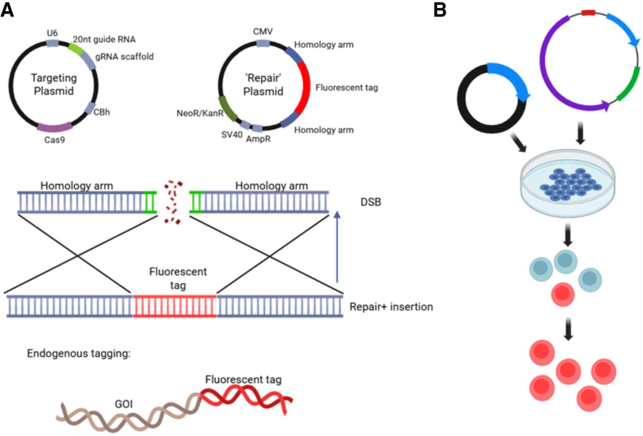 Generating a reporter cell line of the endogenous locus. (A) Using CRISPR-Cas9 to tag a gene of interest (GOI) with a fluorescent tag at the C or N terminus. (B) Following transfection of the CRISPR-Cas9 plasmids and selection of the tagged GOI cell line, GOI expression from its endogenous locus can be quantified by measuring fluorescent signal.