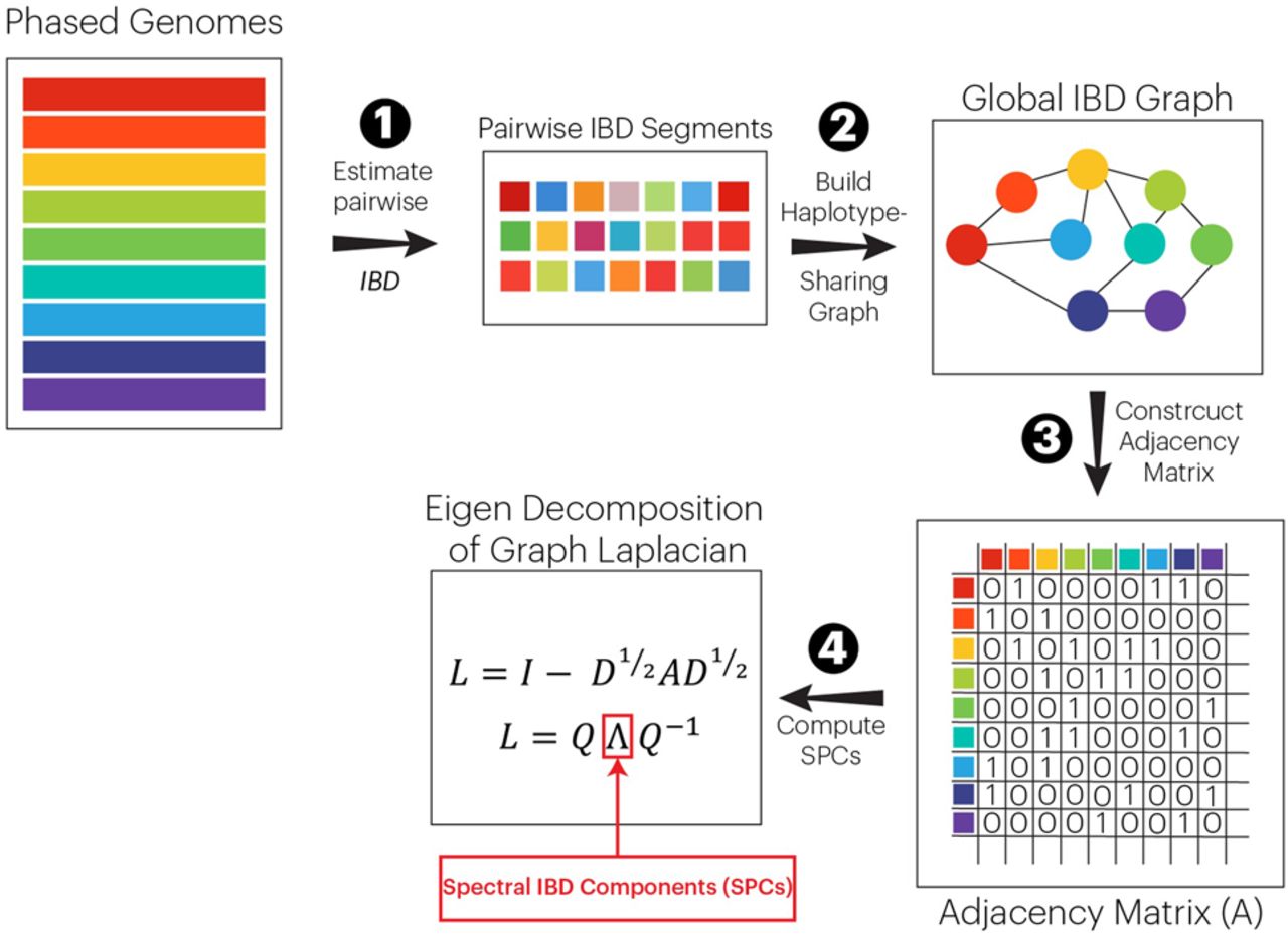 General schema for calculating SPCs. First, phased genotypes are used to estimate segments of genome shared between individuals IBD. Second, the IBD segments are utilized to generate a relatedness graph with vertices representing participants and edges representing aggregated IBD sharing between pairs of participants above a threshold of 6 cM genome-wide. Third, the IBD relatedness graph is transformed into an adjacency matrix (A). Finally, the adjacency matrix A is transformed into its Laplacian form. The eigenvectors corresponding to the smallest eigenvalues of this matrix comprise the set of SPCs.