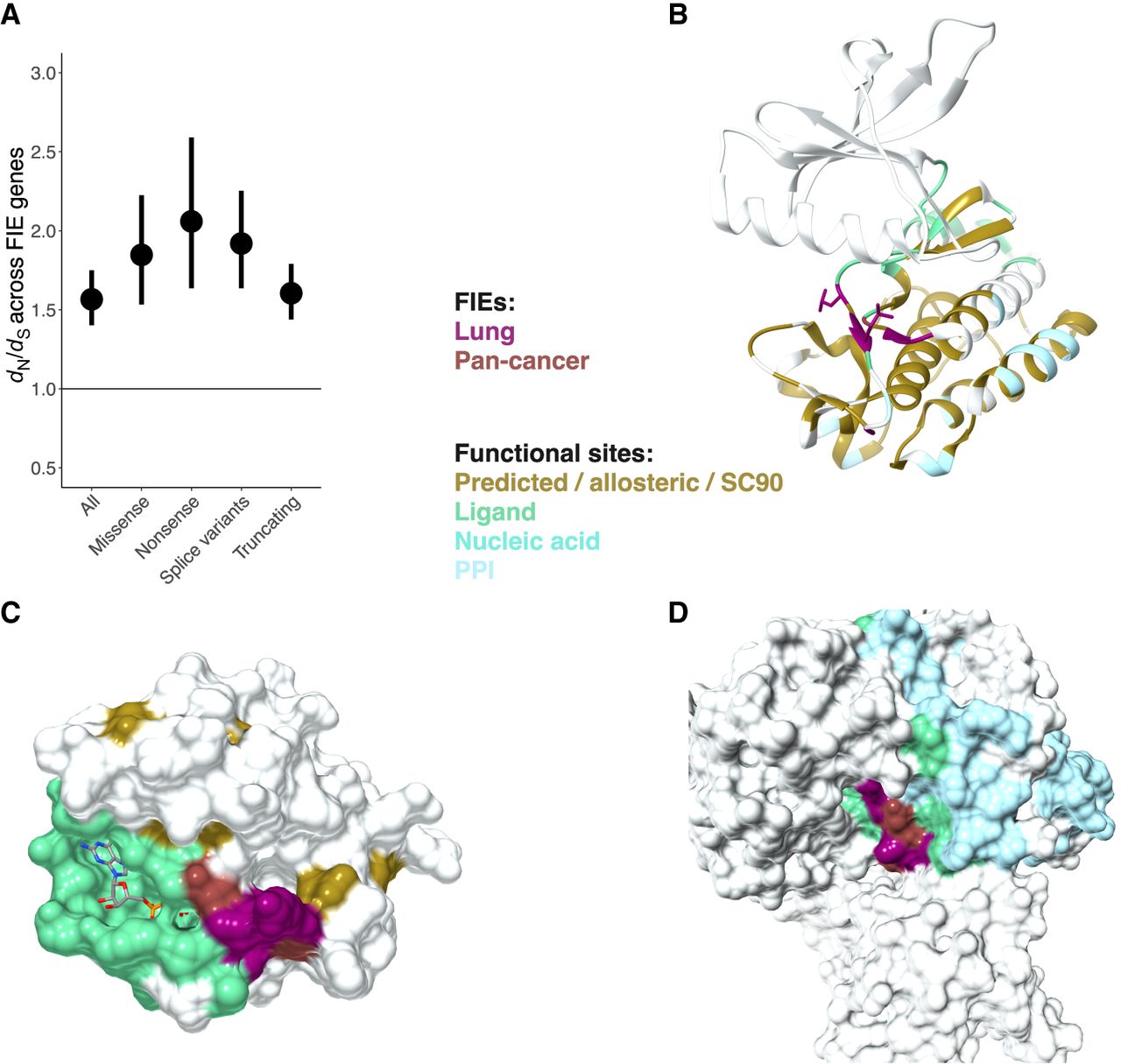 Lung FIE genes are under positive selection and include both known cancer genes and predicted novel drivers in paralogs that are also likely to affect protein function. (A) FIE genes (score ≥ 3) were under positive selection (dN/dS > 1.5). (B) FIEs in ERBB tyrosine–protein kinase paralogs EGFR* (lung), ERBB4* (lung), and ERBB2* (pancancer). (C) Ras small monomeric GTPase with LUAD FIEs in genes RRAS2 and RIT within the same FunFam. (D) Rac family small GTPase with LUSC FIEs in genes RAC1* and RAC2 within the same FunFam. (*) Known cancer genes from CGC.