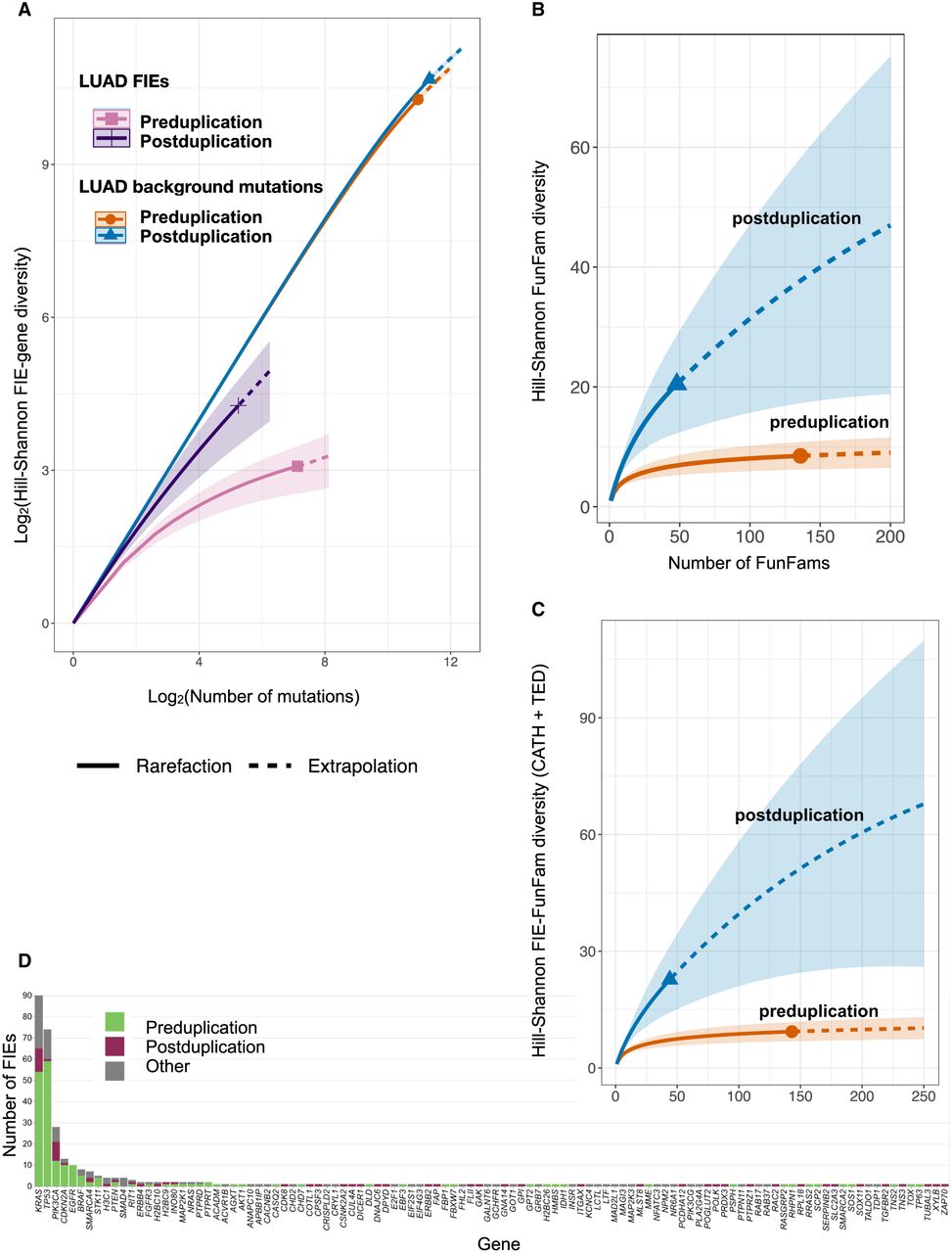 Hill–Shannon FIE-gene and functional family diversity in LUAD before and after duplication. (A) Hill–Shannon FIE-gene diversity significantly increased in LUAD tumors postduplication (95% CI, bootstrapped). Background-mutation-gene diversities did not show an equivalent postduplication increase (95% CI, bootstrapped). Log2–log2 plots compare pre- and postduplication FIE/mutation-gene diversity as a function of the number of FIEs/mutations, using rarefaction to estimate diversity at smaller sample sizes than observed (solid line) and extrapolation to estimate more than twice the observed number of FIEs/mutations sampled (dotted line). (B) Hill–Shannon FIE-FunFam diversity for FIEs derived using PDB structures. (C) Hill–Shannon FIE-FunFam diversity for FIEs derived using PDB structures and TED/AlphaFold models. (D) The long tail in the FIEs per gene distribution.
