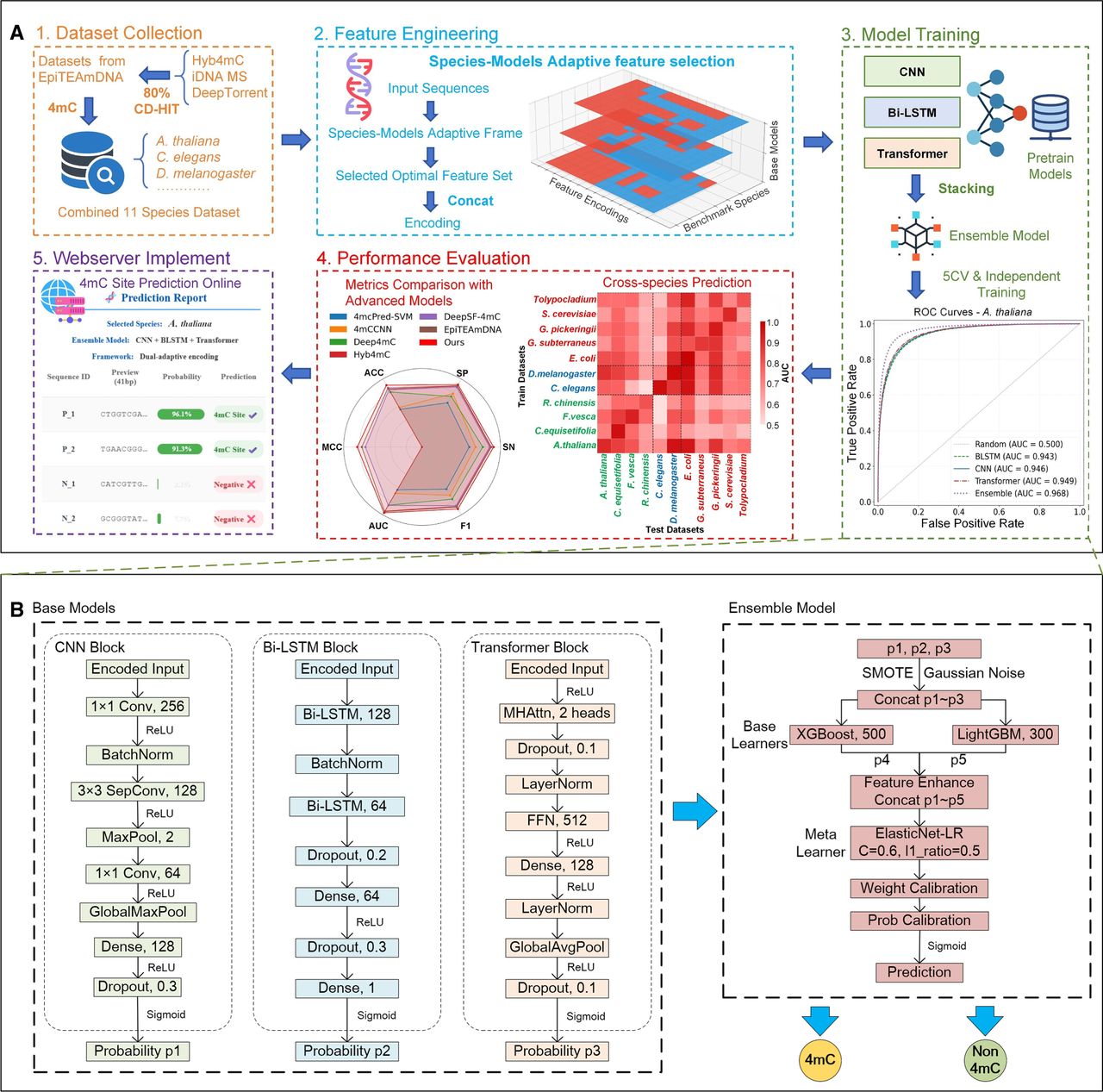 The overall framework of EnDeep4mC. (A) Main workflow of the experiment. (B) Model architecture diagrams of the base model CNN, Bi-LSTM, Transformer, and ensemble model.