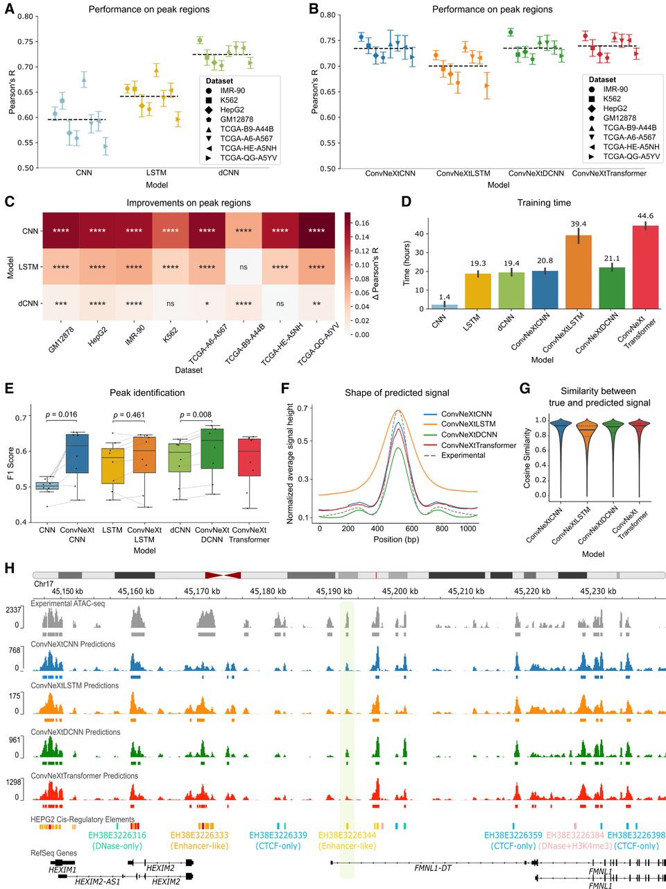 Model comparison across data sets. (A) Pearson’s correlation between true and predicted ATAC-seq signals in peak regions across eight distinct data sets for state-of-the-art models. (B) Performance comparison among the four models proposed in this work (ConvNeXtCNNs, ConvNeXtLSTMs, ConvNeXtDCNNs, and ConvNeXtTransformers) for the ATAC-seq peak regions stratified by cell lines and primary tumor samples. Each point depicts a test chromosome. The black dashed line shows the average performance of a model across all data sets and chromosomes. (C) Improvements of the new ConvNeXt-based methods proposed in this work for the ATAC-seq peaks as compared to existing methods. The significance is calculated with a two-sided Mann–Whitney U test on Pearson’s R calculated for each test chromosome. (****) P ≤ 0.0001, (***) P ≤ 0.001, (**) P ≤ 0.01, (*) P ≤ 0.05, ns: P > 0.05. The Δ Pearson’s R is calculated as the difference between mean Pearson’s R across all chromosomes for a ConvNeXt-based method and the corresponding existing method. (D) The total training time (in hours) of each method on a single RTX2080Ti GPU averaged across eight data sets. The error bar shows 95% confidence interval. Median training time is mentioned over each bar. (E) The F1 score is calculated for all the methods to evaluate the retrieval of ATAC-seq peak calls from the predictions. Each point represents one of the eight data sets. P-values are calculated using the Wilcoxon signed-rank test. (F) The average shape of the predicted ATAC-seq signal is compared against the experimental shape in the ATAC-seq peak regions of the GM12878 cell line. (G) Cosine similarity between experimental ATAC-seq and predicted ATAC-seq in the peak regions of the GM12878 cell line. (H) An example of predicted signal versus the experimental signal around the FMNL1 gene in the HepG2 cell line. A distal enhancer, discovered as a peak only based on the predictions of the ConvNeXtDCNN method, is highlighted.