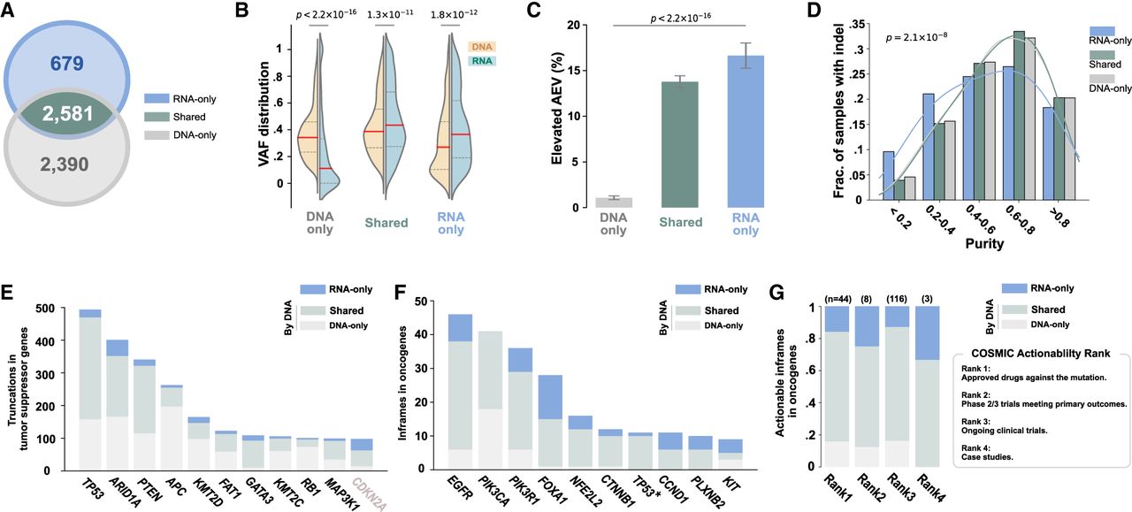 Driver indels detected by RNA-seq and WES in TCGA samples. Driver indels are defined as in-frame mutations in oncogene or truncations in TSGs. (A) Venn diagram showing driver indels detected exclusively by GDC's WES analysis (DNA-only), by our de novo RNA-seq analysis (RNA-only), or by both approaches (shared). (B) Comparison of VAF distributions in WES (DNA) and RNA-seq (RNA) by Mann–Whitney U P-value for driver indels in these three categories. Median VAF is shown by the red line. (C) Comparison of prevalence of elevated AEV indels in these three categories by χ2 test. (D) Tumor-purity distribution for samples containing indels in the three categories. A Kruskal–Wallis test was performed to assess their differences. (E) Top 10 most frequently mutated TSGs contributed by varying indel discovery approaches. CDKN2A (ranked top 11th) is also shown as an example for leveraging AEV for discovery owing to its more than 20-fold higher expression in tumors (Supplemental Fig. S7). (F) Top 10 most frequently mutated oncogenes. (*) TP53 was annotated as “possible oncogene” in glioblastoma multiform (GBM) and low-grade glioma (LGG) by Bailey et al. (2018). (G) Actionability of oncogenic in-frame indels based on COSMIC Actionability database.