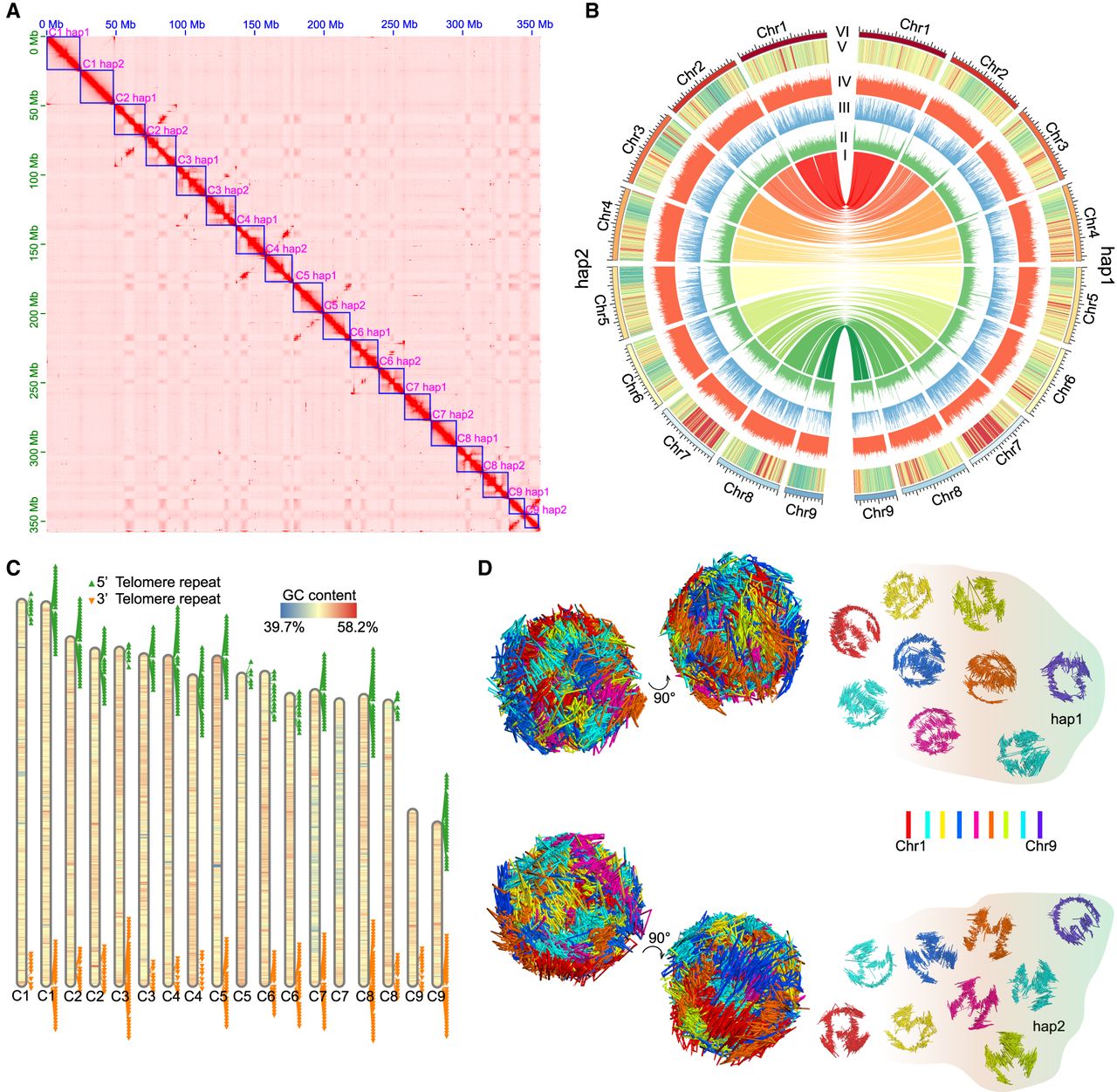 Construction of the haplotype-reserved 3D genome architecture of A. avenae. (A) Hi-C heat map of two haplotype sets of A. avenae; from top to bottom are nine pairs of homologous chromosomes 1–9. (B) Circos plot (Krzywinski et al. 2009) of A. avenae haplotype-resolved T2T genomic features. I: The collinearity between two sets of haplotypes; II: Distribution and abundance of DNA 6mA in chromosomes; III: Distribution and abundance of TE in chromosomes; IV: Distribution and abundance of GC content in chromosomes; V: Heat map of gene expression in a 50-kb window across the genome; VI: The outermost track exhibits the chromosome karyotype in units of 1 Mb. (C) The relative lengths of chromosomes and the distribution of telomeres of the two haplotypes. Each triangle represents two telomeric repeat sequences. The adjacent chromosomes are designated hap1 and hap2, respectively. (D) 3D genome structure of two haplotypes at the mix stage of A. avenae. (Left) Whole genome; (right) the nine autosome pairs visualized separately.