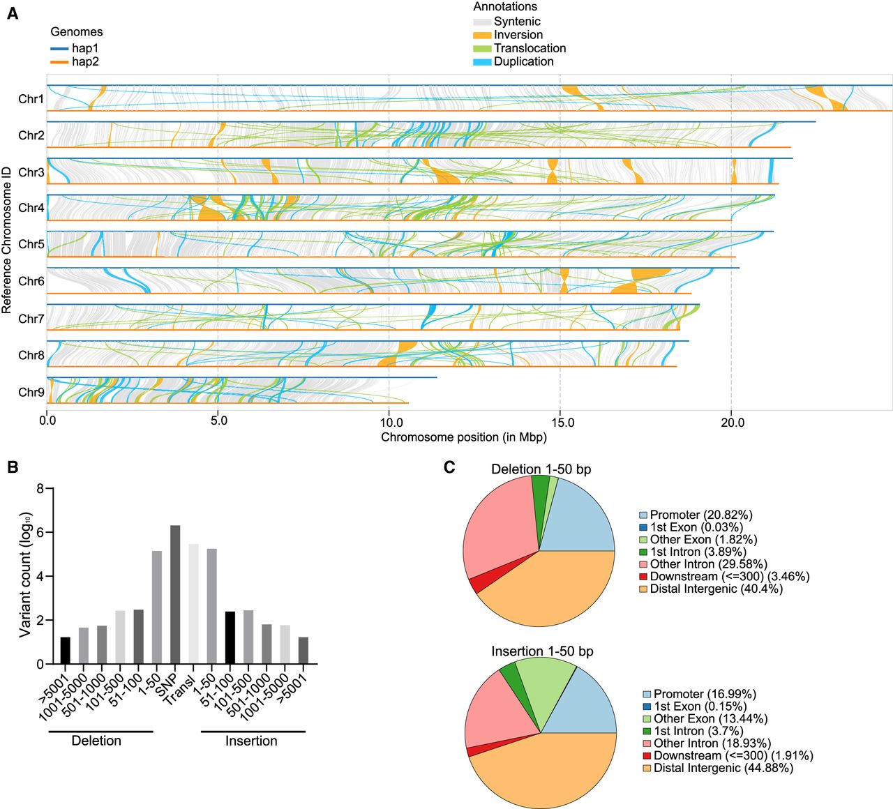 Structural variations between haplotypes. (A) Syntenic analysis of the A. avenae genome. (B) The distribution of variation length was shown using the hap1 genome as reference, and ordinate numbers were logarithmically transformed. (C) Genome-wide annotation of deletion and insertion mutations smaller than 50 bp.