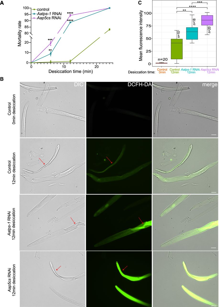 Aap5cs and Aatps-1 contribute to the desiccation-tolerance in A. avenae. (A) Mortality rates of nematodes subjected to different desiccation times after RNAi targeting Aap5cs and Aatps-1. The dsgfp RNA was used as a control. The significance analysis was performed between the treatment group and the control group using a t-test. (**) P < 0.01, (***) P < 0.001, (****) P < 0.0001. (B) After drying for 12 min, the nematodes with different treatments were incubated with the DCFH-DA probe to detect the level of ROS in the nematode's body. The red arrow indicates the dehydrated regions on the nematode. Bar = 20 µm. (C) Quantification of pixel intensity of ROS signal in A. avenae body. P-values were calculated by a two-sided Wilcoxon rank-sum test.