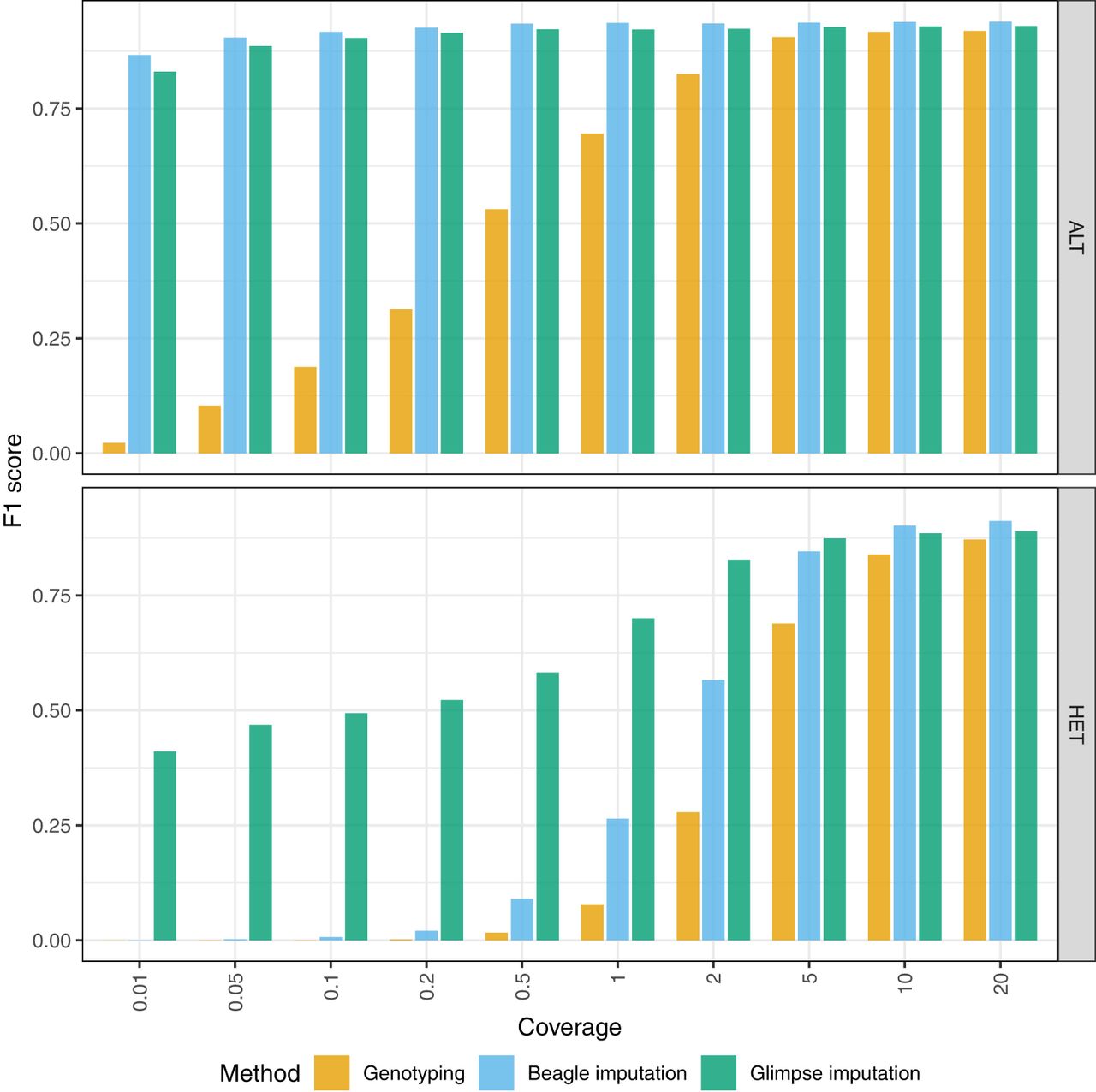 Aggregate F1-scores of alternate allele calls (ALT) and heterozygous calls (HET) across all variant types, generated using each alignment/genotyping method in the impute-first alignment workflow compared with ground-truth HG002.