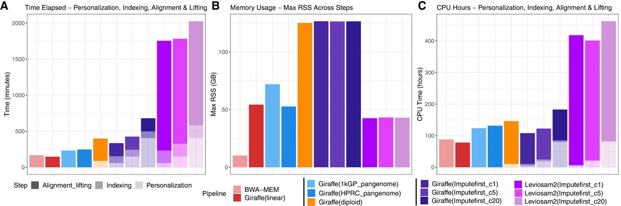 Computational efficiency of personalization, indexing, alignment, and lifting across the evaluated workflows. (A–C) Summarization of wall-clock runtime, peak memory usage, and CPU time for linear (BWA-MEM, Giraffe(linear)), pangenome (Giraffe(1 kGP_pangenome), Giraffe(HPRC_pangenome)), personalized-pangenome (Giraffe(diploid)), and impute-first strategies using either VG Giraffe (Giraffe(Imputefirst_c5), Giraffe(Imputefirst_c20)) or LevioSAM2 (Leviosam2(Imputefirst_c5), Leviosam2(Imputefirst_c20)). Bars are shaded to distinguish the types of computation. Note that only the workflow steps that depend on the input data are measured here. “Offline” index building steps that are input data independent are not counted. All workflows were executed using 32 threads, except for the BCFtools consensus and BWA-MEM indexing steps, which ran on a single thread.