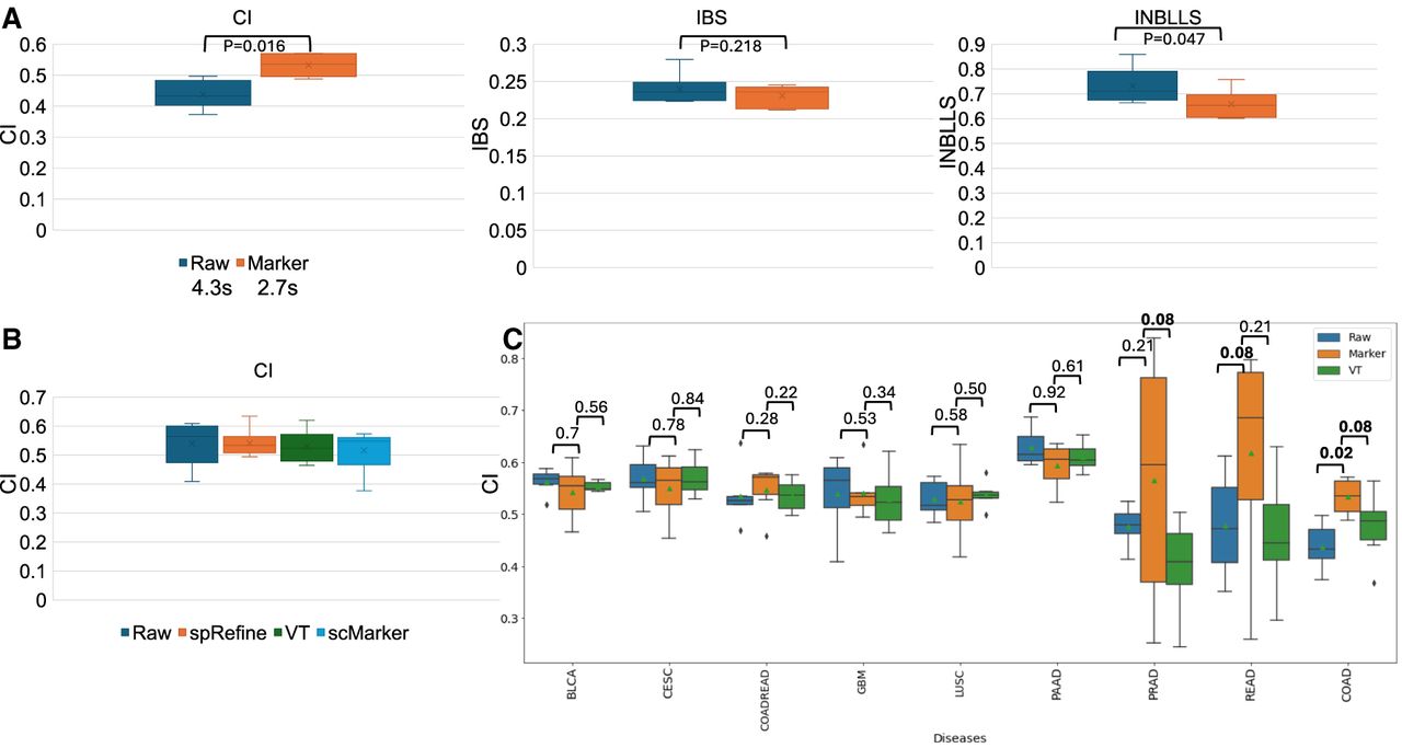 Applications of spRefine for disease modeling. (A) Comparison of survival prediction performances based on three different metrics between raw expression profiles and expression profiles only containing genes selected by spRefine. The cancer type of selected data is COAD. We highlighted the running time comparison and the Wilcoxon rank-sum test (one-side) p-value (P) in this panel. (B) Comparison of survival prediction performances across marker genes from different sources. (C) Comparison of survival prediction performances across different gene sets based on the cancer types from different cancer types. We annotated the Wilcoxon rank-sum test (one-side) p-value (P) in this panel, and highlighted the significant result (p − value < 0.1).