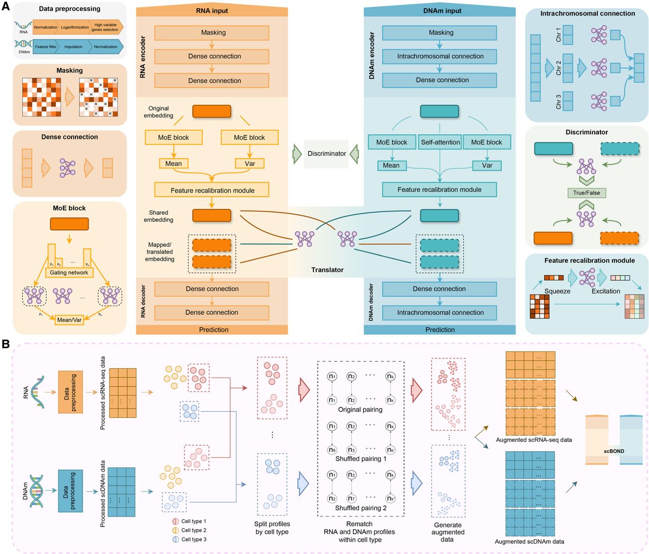 Overview of the scBOND framework and its variant scBOND-Aug. (A) The model features a dual-stream VAE design, with modality-specific encoders and decoders for translation. RNA and DNAm inputs undergo separate preprocessing steps, followed by masking and dense feature extraction. The RNA and DNAm translators perform the translation of each modality. A discriminator is employed to differentiate between real and translated embeddings. (B) The augmentation strategy of scBOND-Aug. scRNA-seq and scDNAm profiles are first preprocessed and then grouped by annotated cell type. Within each group, original cross-modal pairings are disrupted by randomly shuffling scDNAm profiles to generate biologically coherent synthetic pairs. These augmented data are then used to expand the training set for improved generalization under limited sample scenarios.