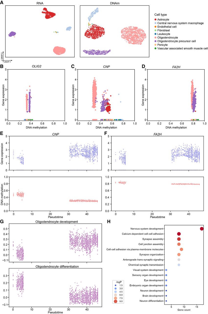 Transcriptomic–epigenetic dynamics in the oligodendrocyte lineage. (A) UMAP visualization of RNA and predicted DNAm profiles on the HumanBrainB data set. (B–D) Scatter plots showing the relationship between gene expression and promoter-proximal DNA methylation levels across cell types for three key oligodendrocyte lineage genes: OLIG2, CNP, and FA2H. (E,F) Pseudotime dynamics of CNP and FA2H gene expression and promoter-proximal DNA methylation along the oligodendrocyte lineage trajectory. (G) Pseudotime-based module scores of two biological processes: oligodendrocyte development and oligodendrocyte differentiation. (H) Bubble plot showing enriched GO terms among genes with significant pseudotime-associated promoter-proximal DNA methylation.