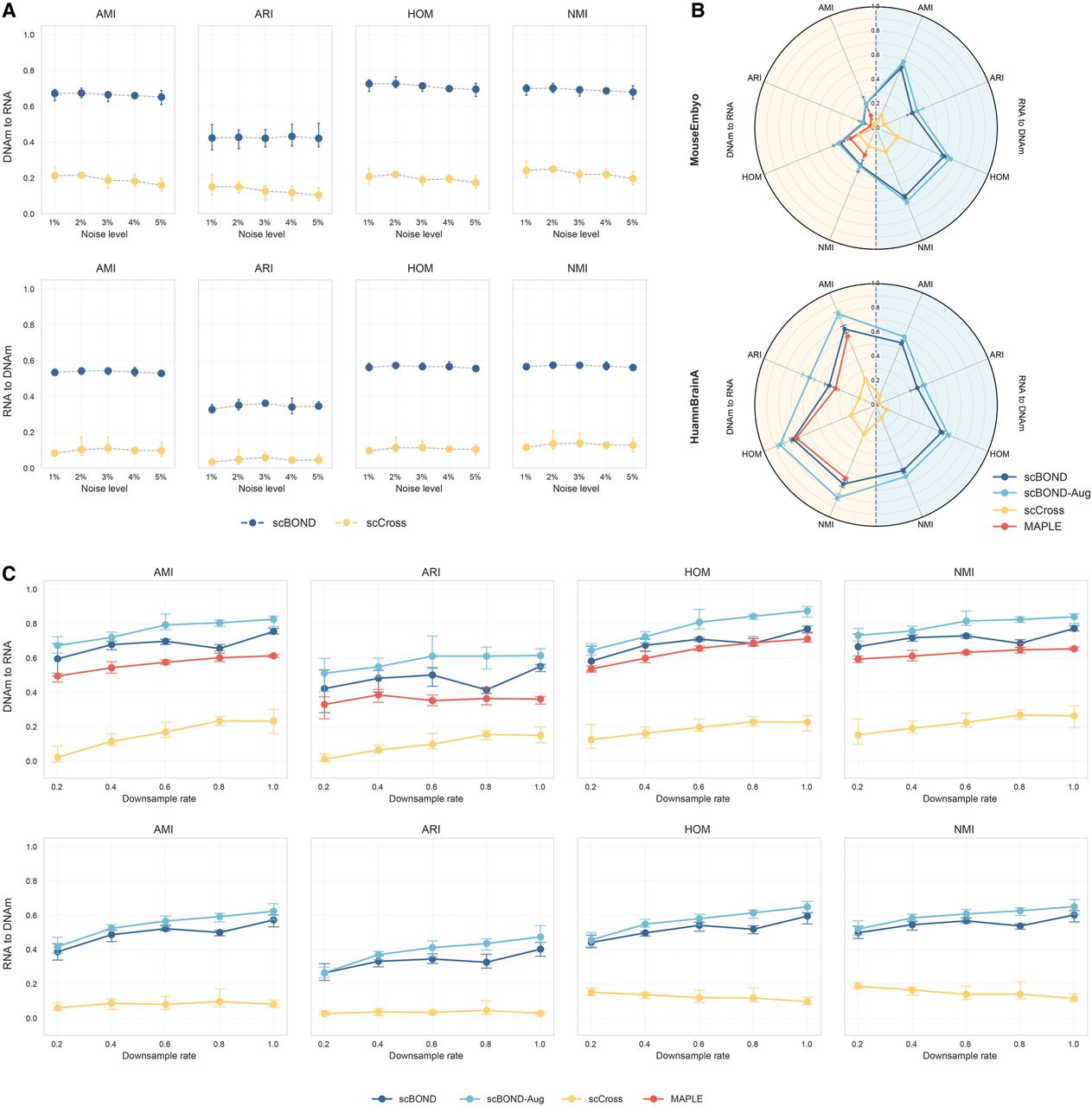scBOND and scBOND-Aug demonstrates robustness and superior performance under data perturbations. (A) Robustness evaluation of scBOND and baseline methods under increasing DNA methylation noise levels (1%–5%) on the HumanBrainA data set. (B) Radar plots comparing the translation performance of scBOND, scBOND-Aug, scCross, and MAPLE across four clustering metrics on two paired data sets. (C) Downsampling experiments on the HumanBrainA data set to evaluate robustness under varying training sample sizes, comparing methods of scBOND, scBOND-Aug, scCross, and MAPLE. The x-axis indicates the proportion of training cells sampled.