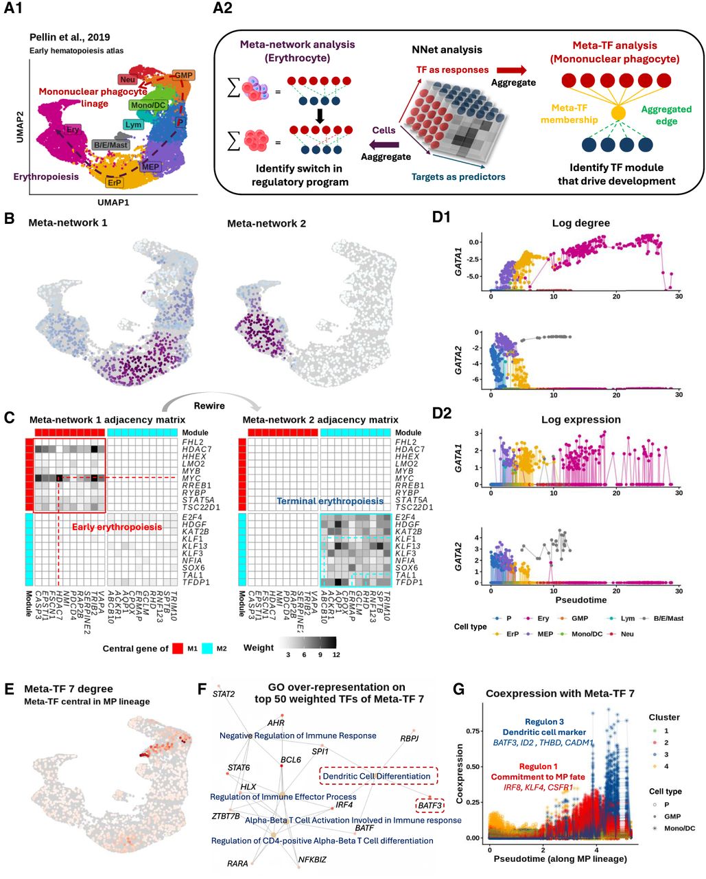 Dynamic coexpression network reveal key transcriptional program shifts during early hematopoiesis. (A) UMAP visualization of bone marrow Lin− cells, depicting the transcriptional landscape of early hematopoiesis (Pellin et al. 2019). P: progenitor, GMP: granulocyte-monocyte progenitor, MP: mononuclear phagocyte, Neu: neutrophil, Lym: lymphoid cell, Mast: Mast cell, MEP: megakaryocyte–erythroid progenitor, ErP: erythroid progenitor, Ery: erythrocyte. (B) Bipartite coexpression networks were constructed for individual cells, linking TFs to target genes. Nonnegative matrix factorization (NMF) was applied to (i) embed the cell dimension into meta-networks and (ii) or to embed the TF dimension into meta-TFs. Meta-network and meta-TF analyses were used to resolve erythropoiesis (B,C) and mononuclear phagocyte (MP) differentiation (E–G). (B) Meta-network analysis assigns cell weights that define soft clusters of cells based on their coexpression patterns. Projecting the soft clusters onto a UMAP shows that the first two meta-networks capture major transcriptional program shifts during erythropoiesis. (C) Aggregating CSNs according to the soft clusters in B yields meta-networks 1/2 (early/late erythropoiesis) representing the clusters. Weighted adjacency matrices of meta-networks are shown as heatmaps. Top 10 TFs (rows) and targets (columns) from each meta-network reveal rewiring from a stemness-associated state (meta-network 1) to erythrocyte-autonomous programs (meta-network 2), indicating an abrupt transcriptional transition. (D) Continuous tracking of GATA gene (GATA1 and GATA2) regulatory dynamics during erythropoiesis. (D1) tracks changes in connectivity (log node degree) for GATA genes within CSNs during erythropoiesis. Compared to the gene expression patterns shown in (D2), connectivity provides a more precise representation of the regulatory dynamics of these TFs, highlighting a distinct switching behavior between GATA2 and GATA1. (E) Meta-TF analysis assigns TF weights that define modules (i.e., soft clusters) of TFs based on their coexpression patterns. Aggregating TFs according to these modules yields simplified CSNs that summarize meta-TF–target coexpression. Degree of meta-TF 7 across cells were projected onto the UMAP. Meta-TF 7 emerged as the first module associated with the MP lineage, displaying the highest connectivity within GMPs. (F) Over-representation analysis of the top 50 TFs that composes meta-TF 7 identifies immune differentiation pathways. TFs linked to the enriched terms are colored based on their weights on meta-TF 7. (G) Meta-TF 7’s coexpression with each target gene along pseudotime. Each scatter path represents a target. Targets were clustered into four groups based on their coexpression patterns, with clusters 1 and 3 showing staggered activation waves linked to MP commitment and CD141+ dendritic cell maturation.
