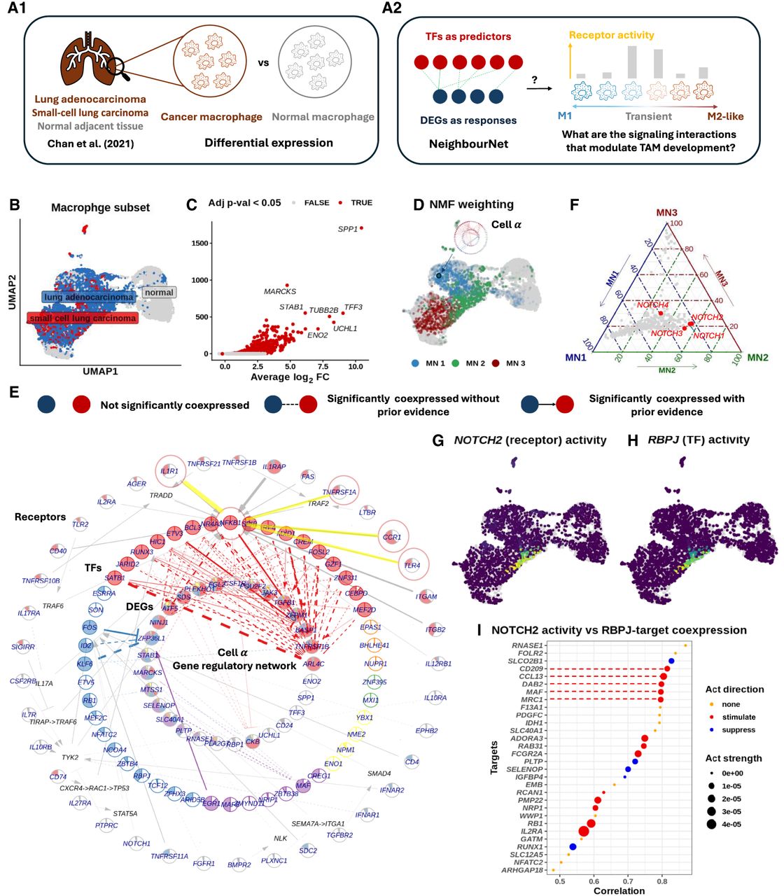Prior knowledge annotation highlights critical signaling interactions facilitate tumor-associated macrophage development. (A) (A1) We focused on the macrophage subset of Chan et al. (2021)’s small cell lung cancer scRNA-seq data set. Using NNet, we aimed to identify the signaling interactions that regulate differentially expressed genes (DEGs) between cancer and normal macrophages, providing insights into how inter- and intracellular signaling interactions shape macrophage identity within the tumor microenvironment. (A2) We utilized NNet’s upstream signaling pathway (USP) inference to identify receptors with high activity in driving TF regulation of DEGs in transient macrophage populations during TAM development. (B) UMAP visualization of macrophages in the data set. (C) Volcano plot of the DE result. Only genes that were upregulated in cancer are shown. Pi value: negative log10 p-value times log2 fold change. (D) Soft clusters of cells for the first three meta-networks, illustrating a key transition from proinflammatory macrophages to TAMs. Cell α, with the highest cell weight on meta-network 1, is highlighted. (E) Annotated coexpression network of cell α. The innermost layer contains response (target) genes, encircled by central TFs in the meta-networks. Receptors occupy the outermost layer, each linked to a TF inferred to mediate that receptor’s influence. If the receptor–TF link is indirect, an extra layer shows the shortest signaling path according to prior knowledge. The Methods section provides details. This network captures the canonical NF-kB pathway in proinflammatory macrophages. (F) Ternary plot of receptor activity scores on the first three meta-networks. NOTCH receptors (NOTCH2/3/4) show peak activity in meta-network 2. (G) NOTCH2 activity and (H) RBPJ connectivity projected onto the UMAP. RBPJ was the TF whose connectivity was found mostly correlated with NOTCH2 activity. (I) Correlation between NOTCH2 activity and different targets’ coexpression with RBPJ. The top targets with the highest correlations are illustrated. NOTCH2 activity is strongly associated with M2-like TAM marker expression mediated by RBPJ.