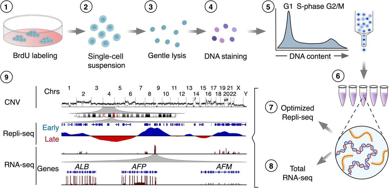 PARTAGE: Parallel analysis of RT and gene expression. Multiomics approach for the simultaneous profiling of CNV, RT, and transcriptome programs. Target cells are BrdU-labeled (1), dissociated (2), and intact nuclei isolated (3). Then, DNA was stained with cell-permeant dyes (4) and cell cycle analyzed by flow cytometry (5). Nuclei at specific cell cycle stages were collected for nucleic acid copurification (6), and optimized Repli-seq (7) and total RNA-seq (8) were performed. Finally, data analysis and visualization were performed to generate CNV, RT, and gene expression profiles (9).