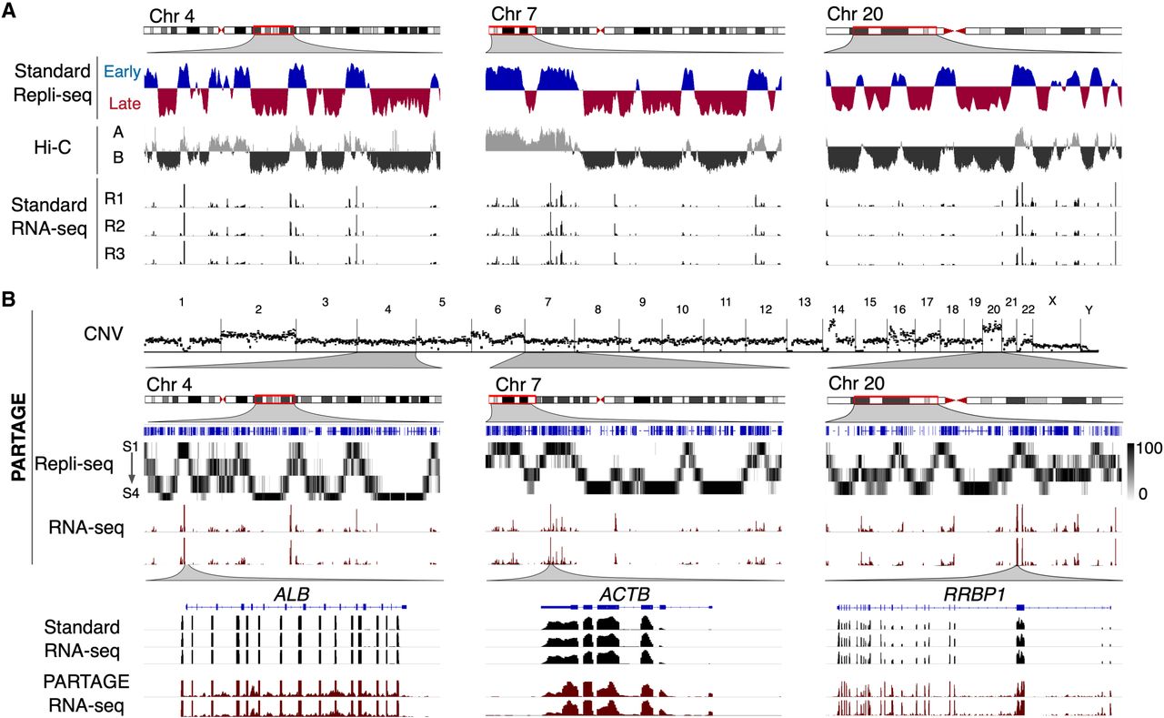 PARTAGE captures CNV, RT, and transcriptomes from the same samples. (A) Standard omics analysis generated from HepG2 cells. Three exemplary chromosomal regions are shown. Standard Repli-seq, chromosome confirmation capture (Hi-C), and RNA-seq were performed from separate sample batches of HepG2 cells. (B) PARTAGE simultaneous mapping of CNV, RT, and transcriptome from HepG2 nuclei. CNV was calculated from the sequencing reads obtained from G1 cell populations. Sequencing reads normalized for depth and per 1-Mb bin are shown. PARTAGE Repli-seq was performed using multifraction RT analysis. Heat map signals of G1-normalized reads are shown per fraction (S1–S4). RNA-seq coverage tracks are shown for the same chromosomal regions. Bottom tracks show a comparison between standard and PARTAGE RNA-seq signals zoomed in on hepatic-specific (ALB) and housekeeping genes (ACTB and RRBP1).