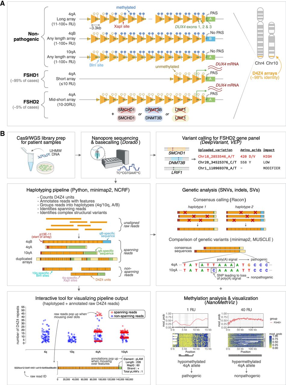 D4Z4End2End: an all-in-one, long-read-based workflow for the genetic and epigenetic analysis of FSHD. (A) Schematic of the pathogenesis of FSHD. The causative locus of FSHD is the D4Z4 macrosatellite array at the Chromosome 4q subtelomere, which comprises 1 to >100 ∼3.3 kb tandem repeat units. FSHD occurs in the presence of (i) a PAS-containing D4Z4 haplotype (4qA), which enables stable DUX4 expression and (ii) epigenetic dysregulation of the array, which can occur via array contraction (FSHD1) or pathogenic variants in chromatin modifiers (FSHD2). Both FSHD1 and FSHD2 are associated with D4Z4 hypomethylation and ectopic DUX4 expression in skeletal muscle. A nonpathogenic, homologous D4Z4 array is located at the Chromosome 10q subtelomere. A 4q-specific XapI site and 10q-specific BlnI site is used to distinguish 4q and 10q alleles in Southern blot assays. (B) Overview of the all-in-one, long-read-based workflow for FSHD. Ultra-high-molecular-weight (UHMW) DNA is used to perform Oxford Nanopore Technologies (ONT) Cas9-targeted or whole-genome sequencing (WGS). Canonical and 5mCG basecalling is performed using Dorado. Variants in reads overlapping FSHD2-associated genes are called using DeepVariant (Poplin et al. 2018), and the potential pathogenicity of these variants is assessed using Variant Effect Predictor (VEP) (McLaren et al. 2016). For assessment of the D4Z4 array, raw reads are input into a custom script which annotates and haplotypes D4Z4 reads (Supplemental Code). The output of the haplotyping pipeline can be explored using an interactive visualization tool, which displays raw reads as individual dots grouped into their haplotypes and plotted based on their number of D4Z4 repeat units (y-axis), and highlights 4q and 10q spanning reads. Hovering over individual dots displays the annotated raw read. Accurate consensus sequences for 4q and 10q alleles can be generated from spanning reads using Racon (Vaser et al. 2017), enabling analysis of allele-specific D4Z4 genetic variants. Allele-specific, array-wide methylation analysis is performed using NanoMethViz (Su et al. 2021, 2025), allowing detection and visualization of FSHD1- and FSHD2-specific methylation patterns.