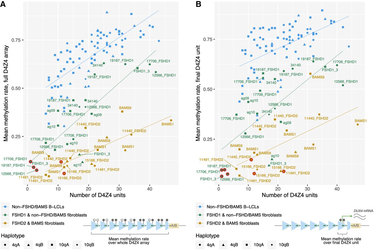 Correlation of allelic D4Z4 methylation levels with the number of repeat units. Mean methylation rates of individual alleles across (A) the full 4q/10q D4Z4 arrays or (B) the final D4Z4 unit against the number of D4Z4 units, plotted for alleles from SMCHD1-wild-type fibroblasts (FSHD1 and non-FSHD/BAMS), pathogenic-SMCHD1-variant fibroblasts (FSHD2 and BAMS), and 30 B-lymphoblastoid cell lines (B-LCLs) from the 1000 Genomes Project (Gustafson et al. 2024). Sample 34,140, initially clinically diagnosed as FSHD2, was included in the “non-FSHD/BAMS” group based on the lack of pathogenic SMCHD1, LRIF1, or DNMT3B variants and overall methylation profile. Mean methylation rate was calculated as the total number of methylated CpGs from all reads/the total number of methylated + unmethylated CpGs from all reads, across the defined regions. Regression lines were plotted for each group of samples. Alleles presumed to be the pathogenic alleles for each of the FSHD patients are indicated with red rings. (A) Pearson and Spearman’s correlation coefficients for FSHD1 and non-FSHD/BAMS fibroblasts, FSHD2 and BAMS fibroblasts, and B-LCLs were 0.844 and 0.826, 0.757 and 0.742, and 0.746 and 0.798, respectively. (B) Pearson and Spearman’s correlation coefficients for FSHD1 and non-FSHD fibroblasts, FSHD2 and BAMS fibroblasts, and B-LCLs were 0.701 and 0.732, 0.583 and 0.607, and 0.531 and 0.552, respectively.