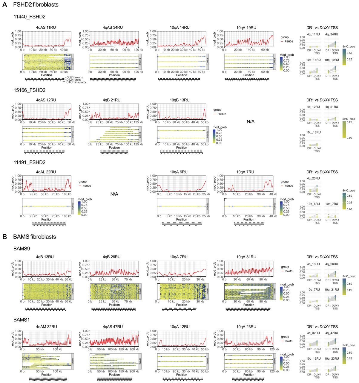 Allele-specific, array-wide D4Z4 methylation profiles for FSHD2 and BAMS fibroblasts. Single-molecule and smoothed methylation plots for 4q and 10q D4Z4 alleles from (A) FSHD2 and (B) BAMS samples, generated using NanoMethViz (Su et al. 2021, 2025). The locations of DUX4 exons are shaded in gray on the smoothed methylation plot. Annotations for D4Z4 repeat units, CTCF insulator regions, and DUX4 exons are shown below each plot. Mean methylation rates over the DR1 region (positions 563–814 of the D4Z4 KpnI-KpnI unit (Hartweck et al. 2013) and DUX4 TSS region (−200 to +200 with respect to the TSS at position 1688 of the D4Z4 KpnI-KpnI unit) within each D4Z4 unit were also plotted for each allele. Points for DR1 and DUX4 TSS regions from the same D4Z4 unit are connected by gray lines. The full-length reference sequences for the BAMS1 4qAM and 4qAS alleles were determined as described in Supplemental Figs. S4 and S13.