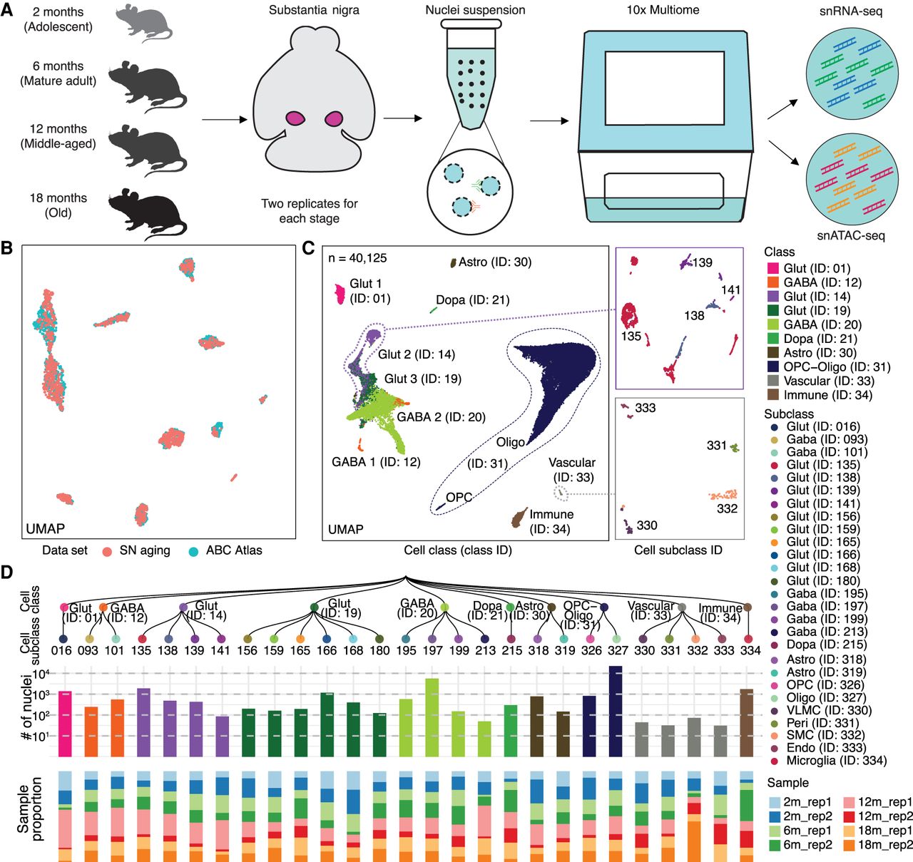 Single-nucleus multiomic analysis of the mouse substantia nigra across aging. (A) Schematic of the mouse substantia nigra samples analyzed, with 10x multiome data sets generated at four age stages: 2, 6, 12, and 18 months, with two replicates for each stage. (B) Coembedding UMAP (McInnes et al. 2018) of cells from the Allen Brain Cell (ABC) Atlas (Yao et al. 2023) scRNA-seq data and snRNA-seq data from this study, colored by data set. SN, substantia nigra. (C) UMAP embedding and clustering analysis of snRNA-seq data (n = 40,125 nuclei) from this study, with cells colored based on cell classes. The panels show examples where cell classes are separated into subclasses, and cells are colored based on cell subclass IDs. Cell class and subclass are annotated according to the ABC Atlas (Yao et al. 2023). Detailed information is provided in Supplemental Table S1. (Astro) astrocyte; (OPC) oligodendrocyte precursor cells; (Oligo) oligodendrocytes; (Glut) glutamatergic; (Gaba) GABAergic; (Dopa) dopaminergic; (VLMC) vascular leptomeningeal cells; (Peri) pericytes; (SMC) smooth muscle cells; (Endo) endothelial cells. (D) Top: Taxonomy tree of the 27 cell subclasses organized in a dendrogram, with cell class and subclass IDs marked. Middle: Bar plots representing the number of nuclei analyzed per subclass, colored by cell class. Bottom: Bar plots showing the proportion of nuclei in each sample for each subclass. 2 m: age 2 months; 6 m: age 6 months; 12 m: age 12 months; 18 m: age 18 months; rep1: replicate 1; rep2: replicate 2.