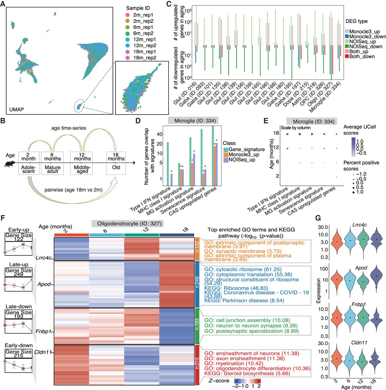 Profiling of age-associated gene expression variations across substantia nigra cell subclasses. (A) UMAP representation of all nuclei, colored by sample IDs. (B) The two comparison models used for age-associated differential expression analysis. (C) Summary of the number of age-associated DEGs identified within each subclass, categorized by upregulated or downregulated effect size and colored by comparison models (Monocle3 [Trapnell et al. 2014] linear model, FDR < 0.05; NOISeq [Tarazona et al. 2015] pseudobulk, probability > 0.95; and overlap in both methods). up, upregulated DGEs in aging; down, downregulated DEGs in aging. (D) Recurrence of age-related signatures in age-associated DEGs within the microglia subclass. Asterisks represent significant enrichment (FDR < 0.05) by hypergeometric test. IFN, interferon; MHC, major histocompatibility complex; MG, microglia; CAS, common aging score. (E) Dot plot representing the aggregated expression of age-related signatures across ages in the microglia subclass. Dot color and size represent the scaled average aggregated signature score calculated by UCell and scaled percent of positive scores of all nuclei, respectively. (F) Groups of age-associated DEGs within the oligodendrocytes subclass. Left: Box plots representing gene expression across ages for four DEG groups. Middle: Heat map of pseudobulk gene expression for each DEG group across ages. Right: Top significant GO and KEGG enrichments for genes in each DEG group in oligodendrocytes subclass. Early-up, early upregulated DEGs in aging; Late-up, late upregulated DEGs in aging; Early-down, early downregulated DEGs in aging; Late-down, late downregulated DEGs in aging. (G) Expression distribution of all nuclei in the oligodendrocytes subclass across ages for representative genes from the four age-associated DEG groups in panel F.