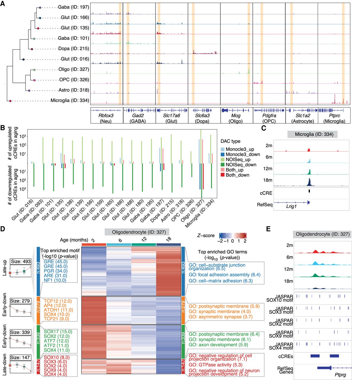 Age-associated differentially accessible cCREs across cell subclasses in the mouse substantia nigra. (A) Genome Browser tracks of aggregate chromatin accessibility profiles for representative subclasses at selected marker gene loci, with yellow blocks highlighting the representative regions. (B) Summary of the number of age-associated DACs (FDR < 0.05 for the Monocle3 model; probability > 0.95 for the NOISeq method) identified within each subclass, categorized by upregulated or downregulated effect size and colored by comparison models. up, upregulated DACs in aging; down, downregulated DACs in aging. (C) Genome Browser tracks of aggregate chromatin accessibility profiles for the microglia subclass across ages at a representative DAC locus. (D) Groups of age-associated DACs within oligodendrocytes subclass. From left to right: Box plots representing chromatin accessibility across ages for DAC groups. Top significant motif enrichments for cCREs of each DAC group in oligodendrocytes subclass. Heat map of pseudobulk chromatin accessibility for each DAC group across ages. Top significant GO and KEGG enrichments for cCREs of each DAC group in oligodendrocytes subclass. Late-up, late upregulated DACs in aging; Early-down, early downregulated DACs in aging; Late-down, late downregulated DACs in aging. (E) Genome Browser tracks of aggregate chromatin accessibility profiles for the oligodendrocytes subclass across ages at a representative DAC locus of the Late-down group in panel D. The predicated motif of the SOX family in the JASPAR database is shown at the bottom.