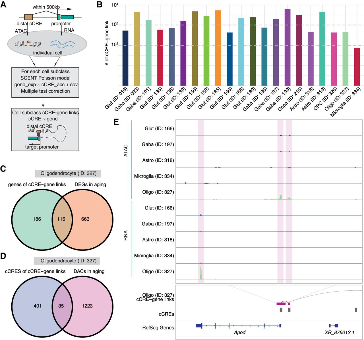 Inference of subclass-specific cCRE–gene links in the mouse substantia nigra. (A) Schematic of the computational strategy for linking chromatin accessibility of cCREs to expression of target genes for each cell subclass. (B) Bar plot showing the number of significantly (FDR < 0.1) correlated cCRE–gene pairs identified in each cell subclass. (C) Venn diagram showing the overlap of genes linked by cCREs and age-associated DEGs in oligodendrocytes. (D) Venn diagram showing the overlap of cCREs linked to genes and age-associated DACs in oligodendrocytes. (E) Genome Browser tracks of aggregate chromatin accessibility profiles and RNA signals for representative subclasses at selected age-associated DAC and DEG pairs.