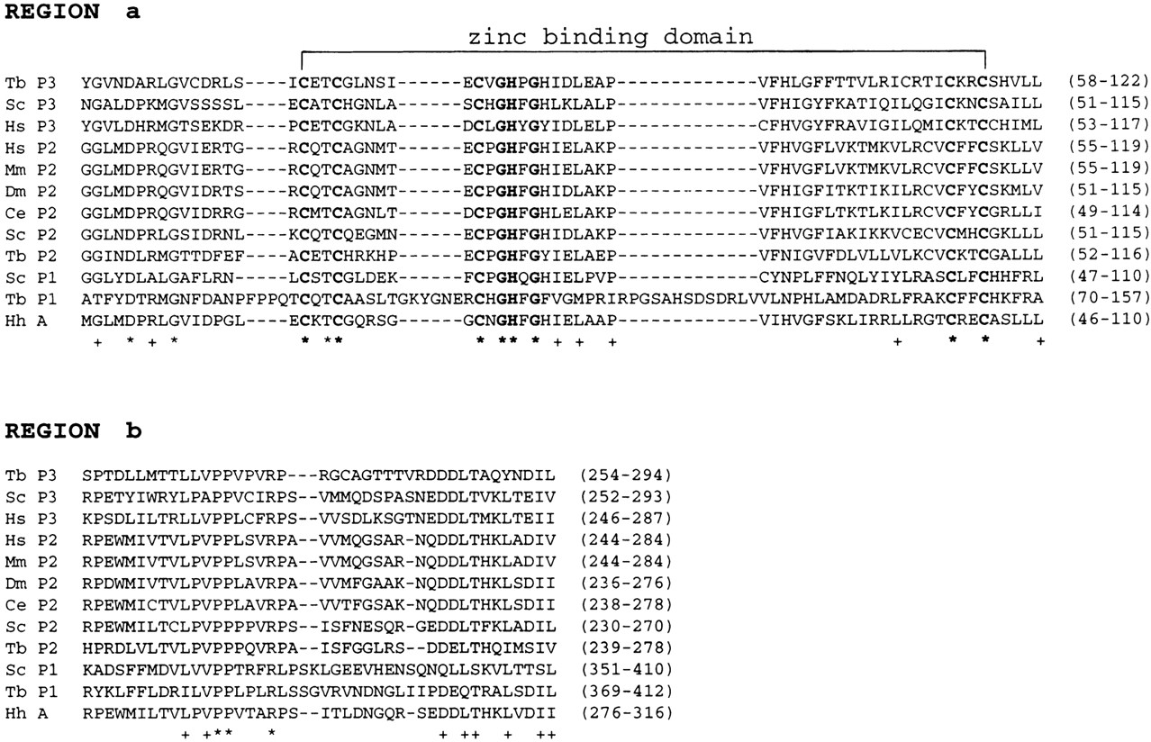 Sequence alignment of the conserved regions a–h of various largest subunits (see p. 1014–1015). The sequence alignments were performed with the CLUSTAL W (v. 1.6) program (Thompson et al. 1994) with the default parameter settings, except for the alignments of the E. coli β′ subunit in the c, f, g, andh regions, which were according to Weilbaecher et al. (1994). Asterisks (*) indicate identities in the 11 eukaryotic sequences; pluses (+) indicate at least 11 out of 12 similarities or identities. The following amino acids were considered similar: V, I, L, and M; D and E; N and Q; R, K, and H; S and T; W, F, and Y. The numbers in parentheses correspond to the first and last amino acids of the sequence shown. The abbreviations for the various organisms are as in Fig. 2. The overlined sequences in regions c, f, and hare not part of the conserved regions and were not included in the percent calculations in Fig. 6. The shaded and underlined residues in the E. coli (Ec) β′ sequences in regions c, f, g, and h correspond to the locations of mutations that affect transcription termination (Weilbaecher et al. 1994). In regiona, the conserved amino acids in the zinc DNA binding consensus motif (bracketed) are indicated in boldface type. In region c,sequences from T7 DNA polymerase and E. coli DNA polymerase I have been aligned as described in Allison et al. (1985). Identities and similarities between either of the DNA polymerase sequences and the human (Hs) P3 sequence are indicated by colons. In the S. cerevisiae (Sc) P2 sequence, A402 was mutated in a sua8suppressor (A402R) (Berroteran et al. 1994). In region d, an invariant motif in all multimeric RNA polymerases is indicated above the alignment, with the D residues involved in Mg+ binding (Zaychikov et al. 1996) in boldface type. The shaded and underlined residues in the Sc P3 sequence correspond to the positions of lethal substitutions; the overlined residues correspond to the positions of single or double (indicated by a bracket) conditional mutants (Dieci et al. 1995). N445 was mutated in a sua8 suppressor (N445S) (Berroteran et al. 1994). In the f region, a putative RNA polymerase III-specific region (Smith et al. 1989a) located upstream of the f region is indicated in boldface type. The isolated residue in bold indicates a position that is occupied by N in all of the α-amanitin-sensitive enzymes, but not in the α-amanitin-resistant enzymes. Residues shaded and underlined in the Sc P3 sequence correspond to the positions of lethal or conditional (indicated in lowercase letters) single, double, or triple alanine scan mutations (Thuillier et al. 1996). The double conditional mutant D829A/R830A in the Sc P3 sequence affects transcription elongation but not transcription complex assembly or formation of the first phosphodiester bond (Thuillier et al. 1996). Residues shaded and underlined in the Mm P2 [L745F, R749P, I779F (Bartolomei and Corden 1995), and N792D (Bartolomei and Corden 1987), mutations], D. melanograster (Dm) P2 [C4 mutation, R741H (Chen et al. 1993)], and C. elegans (Ce) P2 [C777Y/G785E double mutation, cited in Chen et al. (1993)] correspond to the positions of mutations that confer resistance to α-amanitin. In region g, a highly conserved stretch of seven amino acids that is part of the β′ region cross-linked to the 3′ end of nascent RNA (Borukhov et al. 1991) is indicated in boldface type. In the Sc P2 sequence, the shaded and underlined T1080 and S1096 residues indicate the positions of mutations (T1080I and S1096F) that affect start site location (Hekmatpanah and Young 1991). In region h, upstream of the conserved region, the shaded and underlined G residues in the Sc P2 sequence corresponds to the location of a sua8 suppressor (G1388V) (Berroteran et al. 1994).