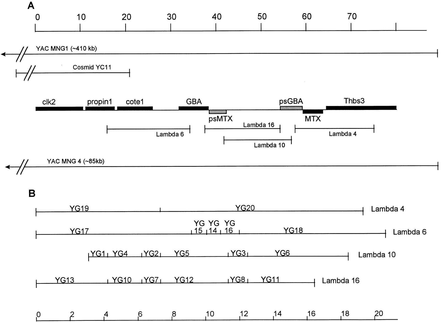 Map of clones and subclones on chromosome 1q21. (A) The YAC clone MNG1 was subcloned to cosmid YC11 or YAC MNG4. The λ subclones were derived from MNG4. The sequences of cosmid and λ subclones were compared to the sequences of genes in the GenBank database. The shaded boxes represent the genes at this locus. Genes shown above the line are transcribed left to right; MTX is transcribed in the opposite direction. (psMTX is not transcribed.) (B) Expanded map of λ clones, showing the EcoRI plasmid subclones used for sequencing.