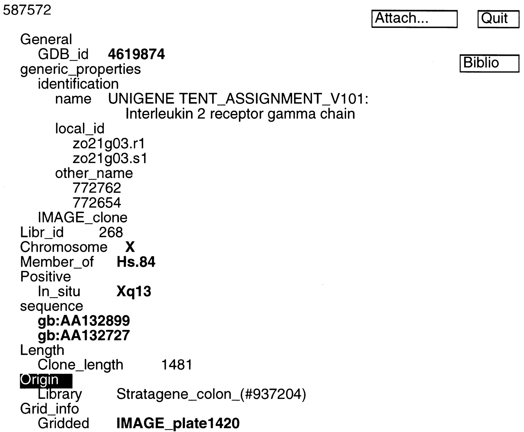 ACeDB display of IMAGE clone 587572. This screen is brought up when the user clicks on clone 587572 in Fig. 2.