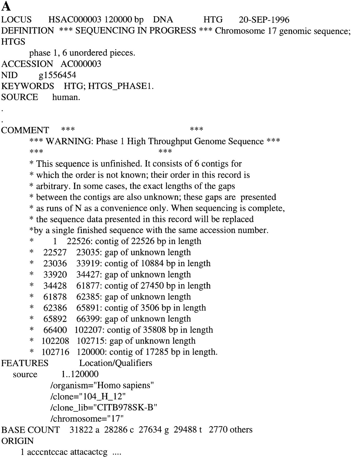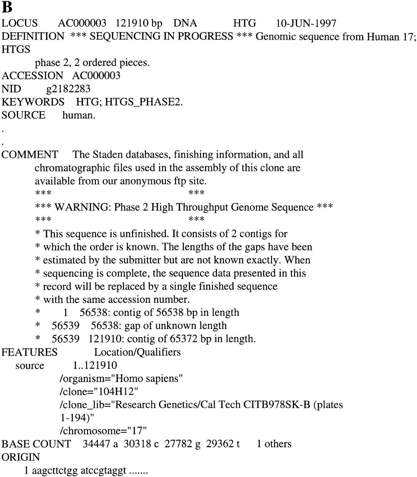 An example of a genomic sequence record (DDBJ/EMBL/GenBank accession number AC000003) as it progresses from an unfinished to a finished state. (These records have been truncated for the printed journal. Full views of these sequence can be retrieved fromhttp://www.ncbi.nlm.nih.gov/Entrez/nucleotide.htmlby entering the corresponding NID numbers (excluding the initial “g”) into the query box and specifying “Sequence ID” as the search field. Using the accession number, i.e., AC000003, as the query term will always and only retrieve the latest (finished) version of the record.) (A) Phase 1 records consist of multiple sequences derived from a single genomic clone such as the insert of a cosmid vector or bacterial artificial chromosome (BAC). The entire insert is represented by a single accession number, even though at this stage it consists of multiple sequence fragments, the order and orientation of which are unknown. Such records can be identified in GenBank by the keywords HTG; HTGS_PHASE1 and are found in the HTG Division of GenBank. (B) Phase 2 records consist of ordered sequence fragments with one or more gaps and are identified by the keywords HTG; HTGS_PHASE2. (C) Phase 3 records represent finished data with no gaps and an assumed accuracy of 10–4 errors or less. When records reach this finished state, they are moved to the appropriate organismal division of GenBank, in this case the Primate (PRI) Division. The only distinctions between these records and traditional GenBank records are their size and the keyword, HTG, which indicates their origin as part of a high-throughput sequencing project. Note well that although the accession number remains constant as the genomic sequence progresses through the various stages of completion, a different nucleotide sequence identifier (NID) number is assigned to each phase (e.g. g1556454 → g2182283 → g2204282). In practice, not all laboratories employ these phase definitions and not all records go through all phases. Some records are submitted initially as finished (phase 3); others may come in initially as phase 1 and updated directly to phase 3. Also note that records tend to include more and more annotation as they progress through the process; however, this is not a requirement for finished sequence and the degree of annotation varies considerably depending upon the submitting laboratory.