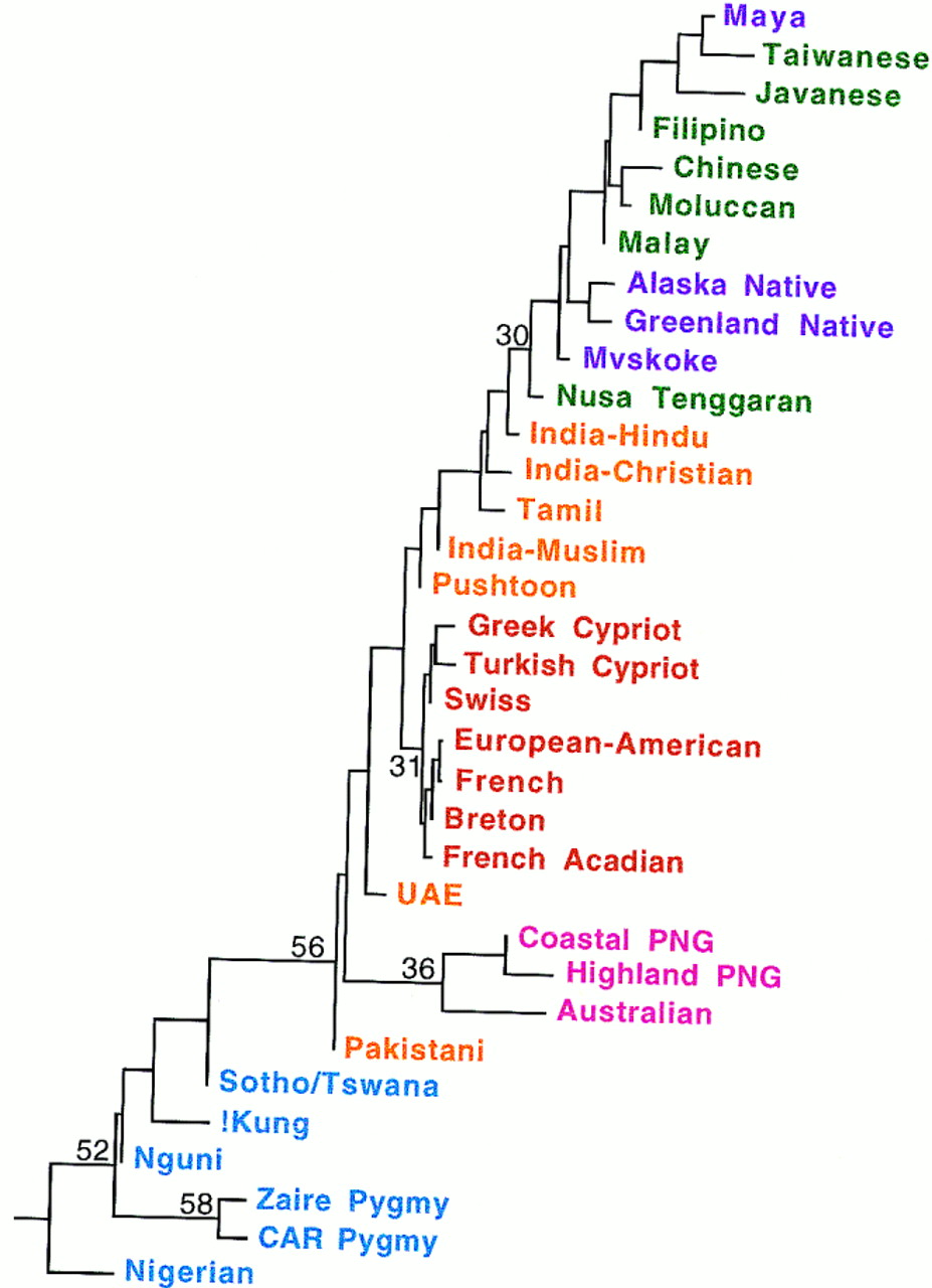 Neighbor-joining tree of population relationships. This tree is rooted where a hypothetical ancestral population—in which the frequency of the Alu element at each of the eight loci is set to 0.0—attaches to the unrooted network. Numbers indicate (in per cent) the fraction of 500 bootstrap replicates that supported a particular grouping.