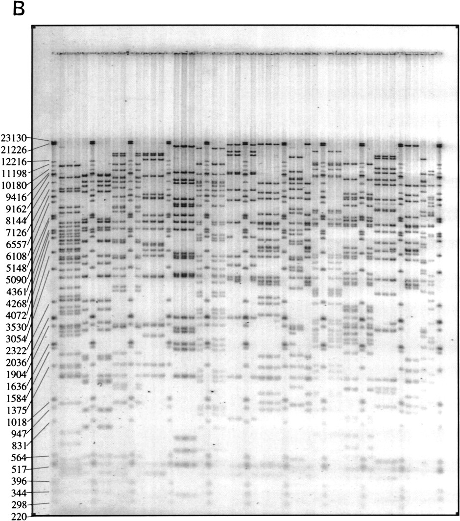 Schematic illustration of the role played by fingerprinting in the construction of sequence-ready contigs. (A) For construction of “local” sequence-ready maps, STSs, and probes specific for a small region, typically 1–2 Mb, are used to identify clones, either by hybridization or PCR methods. The fingerprinting produces higher resolution clone-specific information and facilitates contig construction and selection of clones for sequencing. Intercontig gaps are closed by chromosomal walks using probes developed from end sequences. Clones identified during walks are fingerprinted to determine their relationship to the contigs, permitting recognition of clones spanning intercontig gaps. (B) A typical agarose-mapping gel showing human PACs digested with HindIII. Clones are present in triplicate to verify stability during propagation and to control for the possibility of cross-contaminated glycerol stocks in the intial 384-well format. DNA size standards, which are a mixture of three commercially available markers (see Methods), are present every fifth lane. The sizes, in base pairs, of the marker fragments are indicated.