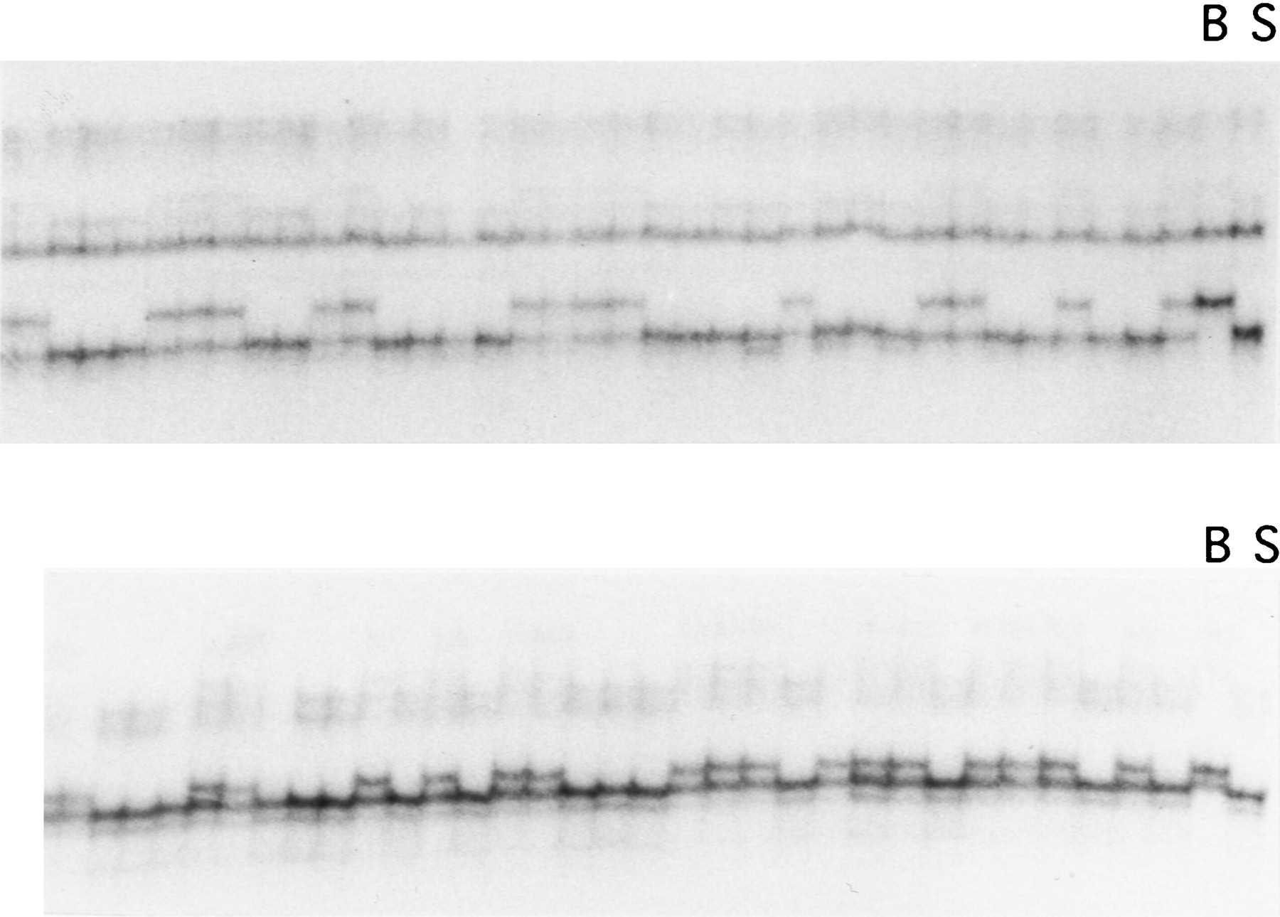 SSCP analysis of two EST-derived PCR amplification products in the BSS interspecific backcross. The two control lanes [(B) C57BL/6J; (S)M. spretus] and a subset of the 94 BSS progeny are shown.